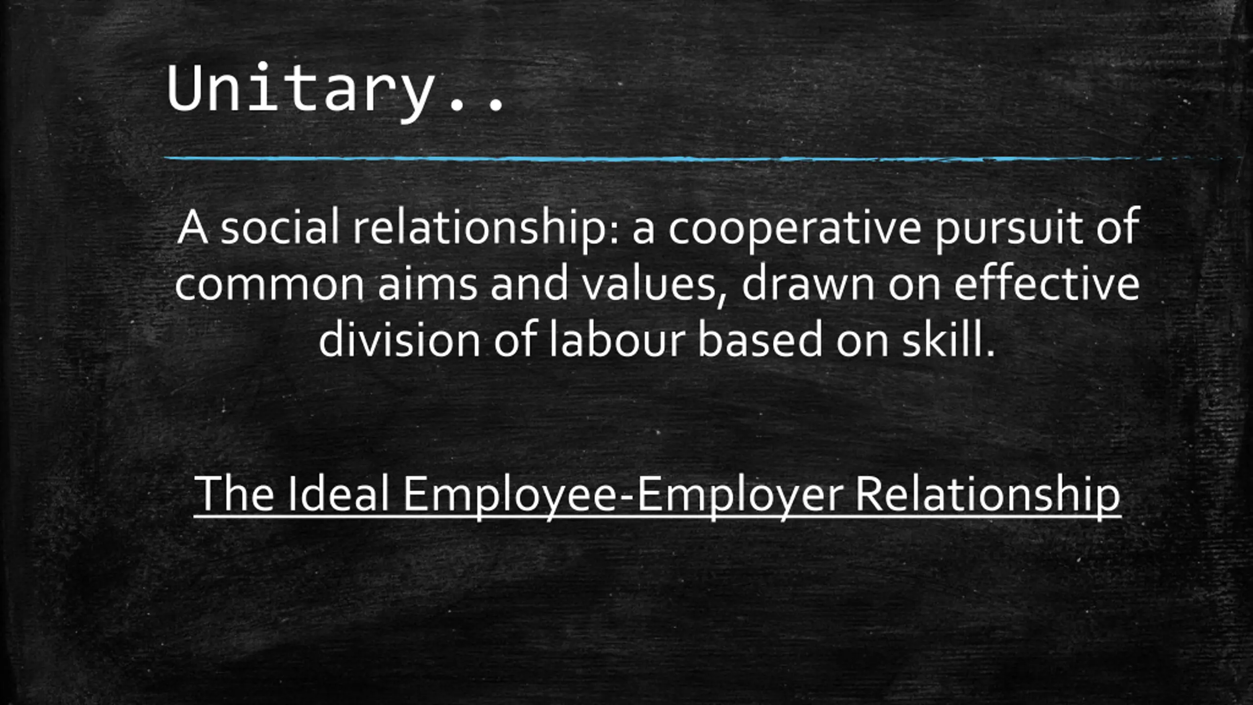 Unitary.. A social relationship: a cooperative pursuit of common aims and values, drawn on effective division of labour based on skill. The Ideal Employee-Employer Relationship