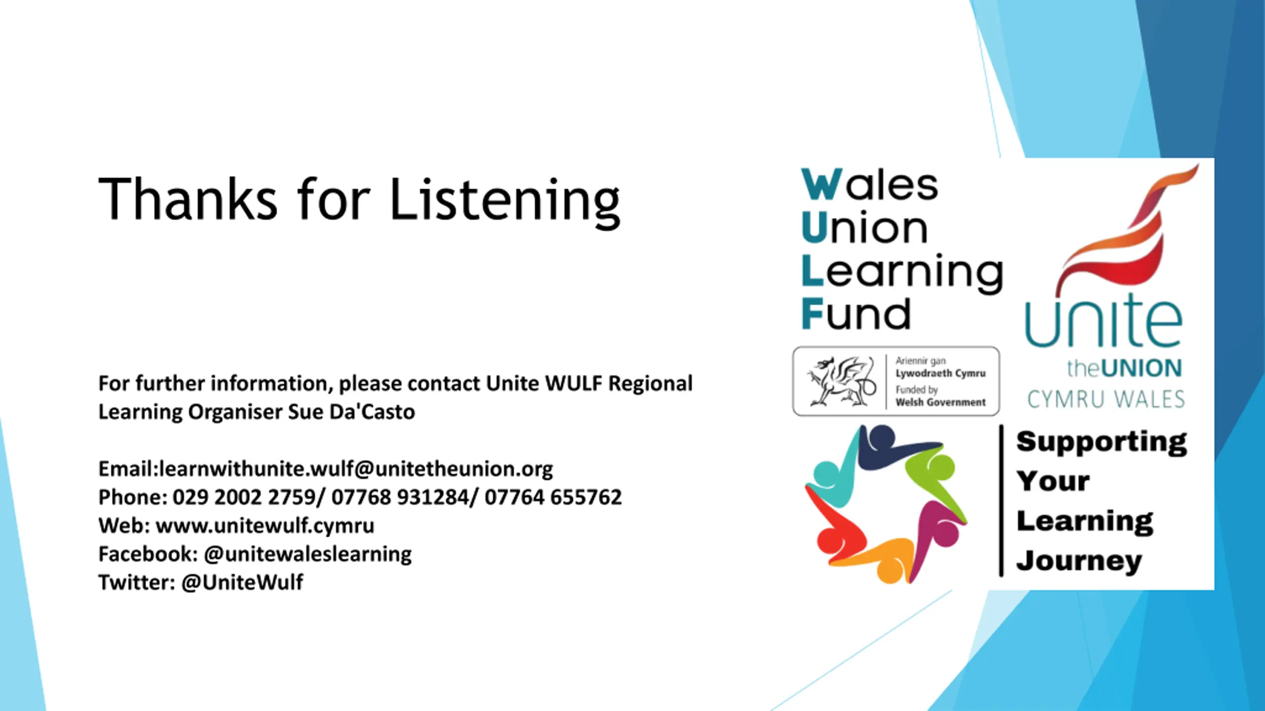 Thanks for Listening For further information, please contact Unite WULF Regional Learning Organiser Sue Da'Casto Email:learnwithunite.wulf@unitetheunion.org Phone: 029 2002 2759/ 07768 931284/ 07764 655762 Web: www.unitewulf.cymru Facebook: @unitewaleslearning Twitter: @UniteWulf