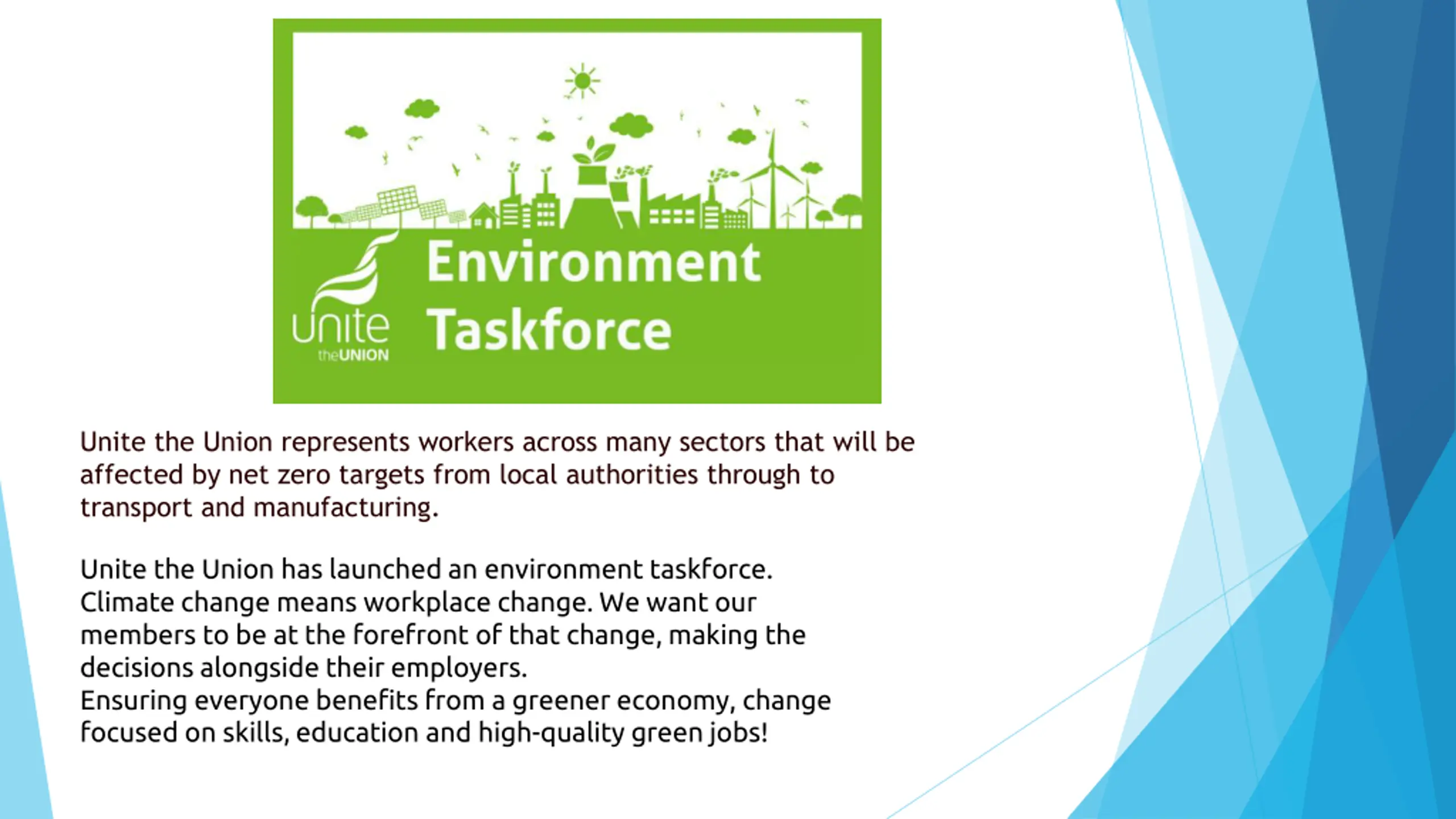 Unite the Union represents workers across many sectors that will be affected by net zero targets from local authorities through to transport and manufacturing. Unite the Union has launched an environment taskforce. Climate change means workplace change. We want our members to be at the forefront of that change, making the decisions alongside their employers. Ensuring everyone benefits from a greener economy, change focused on skills, education and high-quality green jobs!