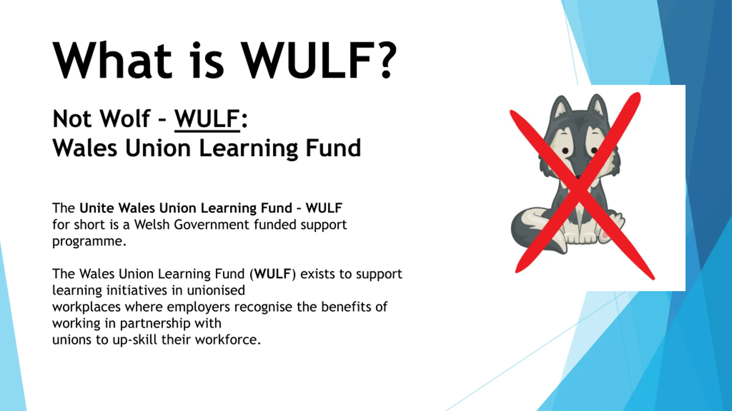 What is WULF? Not Wolf WULF: Wales Union Learning Fund The Unite Wales Union Learning Fund WULF for short is a Welsh Government funded support programme. The Wales Union Learning Fund (WULF) exists to support learning initiatives in unionised workplaces where employers recognise the benefits of working in partnership with unions to up-skill their workforce.