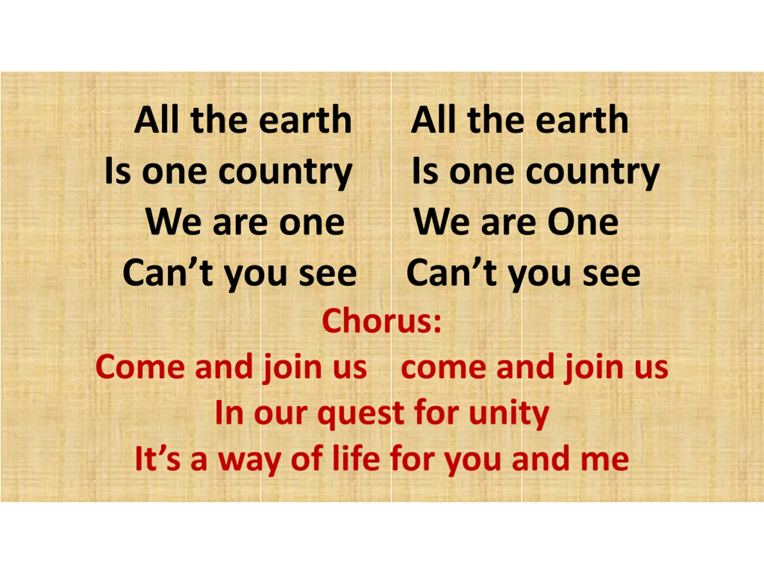 All the earth All the earth Is one country Is one country We are one We are One Can t you see Can t you see Chorus: Come and join us come and join us In our quest for unity It s a way of life for you and me