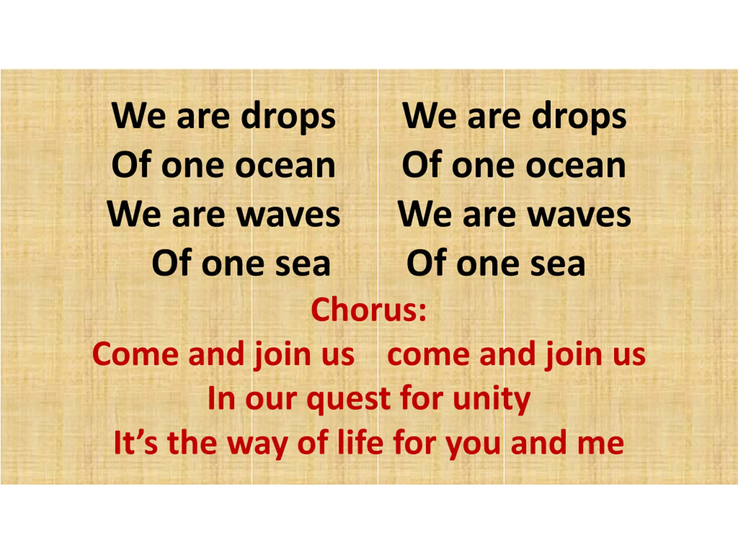 We are drops Of one ocean Of one ocean We are waves We are waves Of one sea Of one sea Chorus: Come and join us come and join us In our quest for unity It s the way of life for you and me We are drops
