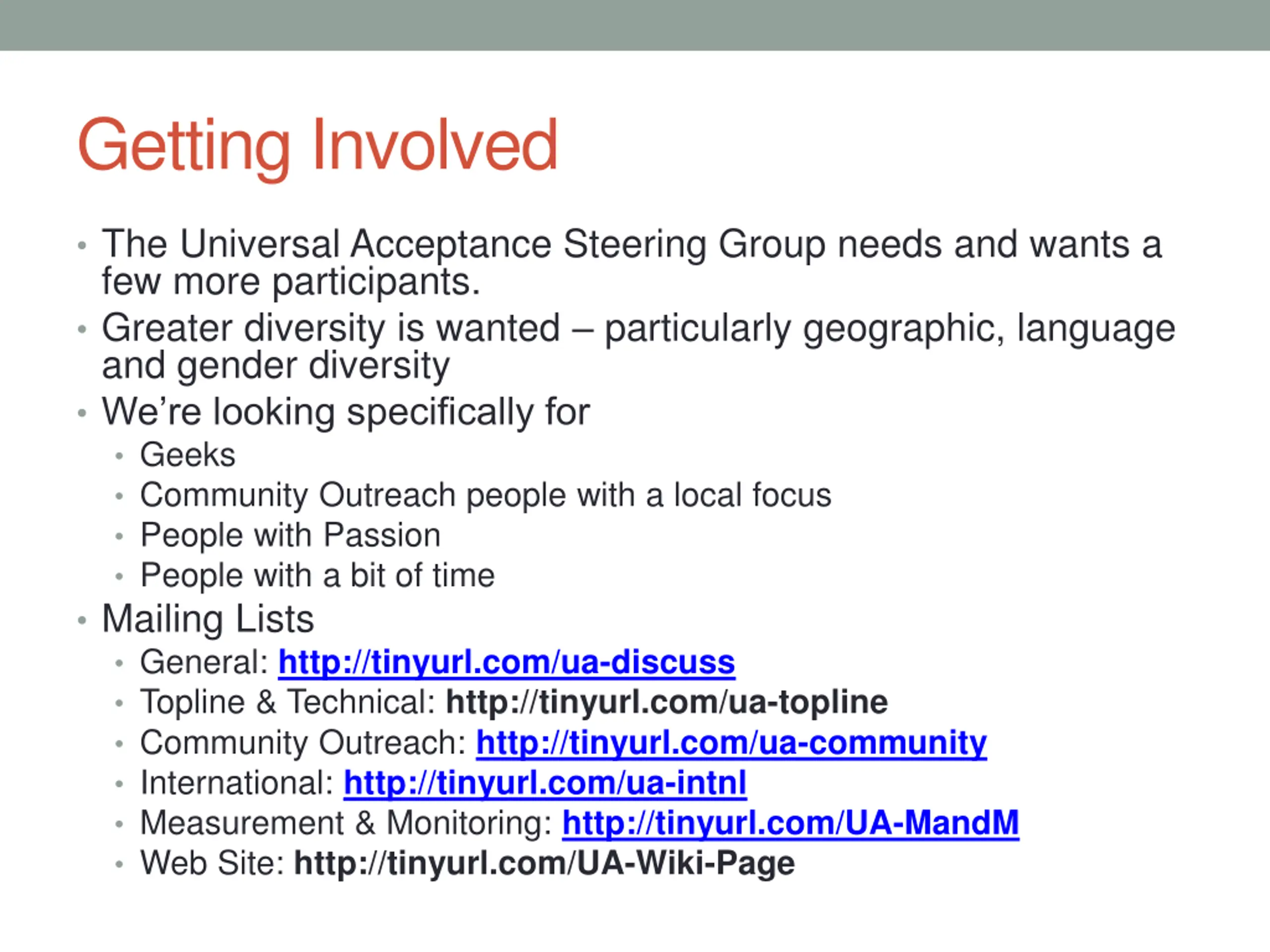 Getting Involved The Universal Acceptance Steering Group needs and wants a few more participants. Greater diversity is wanted particularly geographic, language and gender diversity We re looking specifically for Geeks Community Outreach people with a local focus People with Passion People with a bit of time Mailing Lists General: http://tinyurl.com/ua-discuss Topline & Technical: http://tinyurl.com/ua-topline Community Outreach: http://tinyurl.com/ua-community International: http://tinyurl.com/ua-intnl Measurement & Monitoring: http://tinyurl.com/UA-MandM Web Site: http://tinyurl.com/UA-Wiki-Page