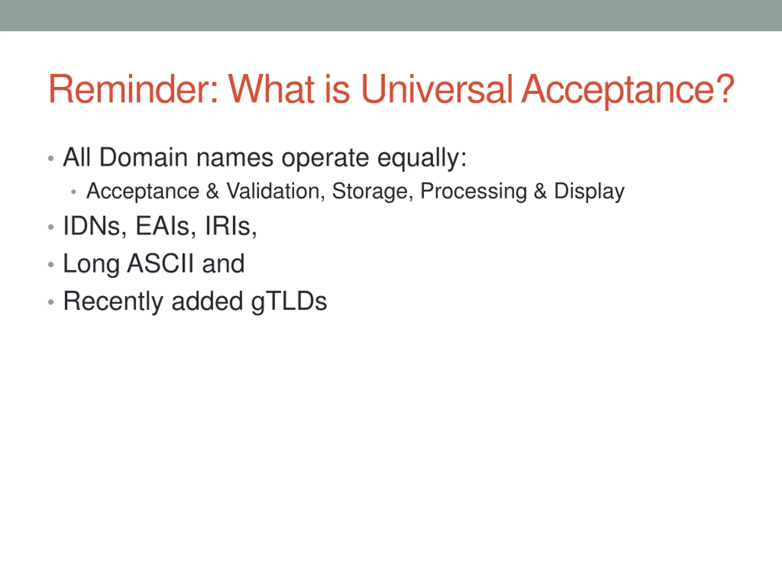 Reminder: What is Universal Acceptance? All Domain names operate equally: Acceptance & Validation, Storage, Processing & Display IDNs, EAIs, IRIs, Long ASCII and Recently added gTLDs