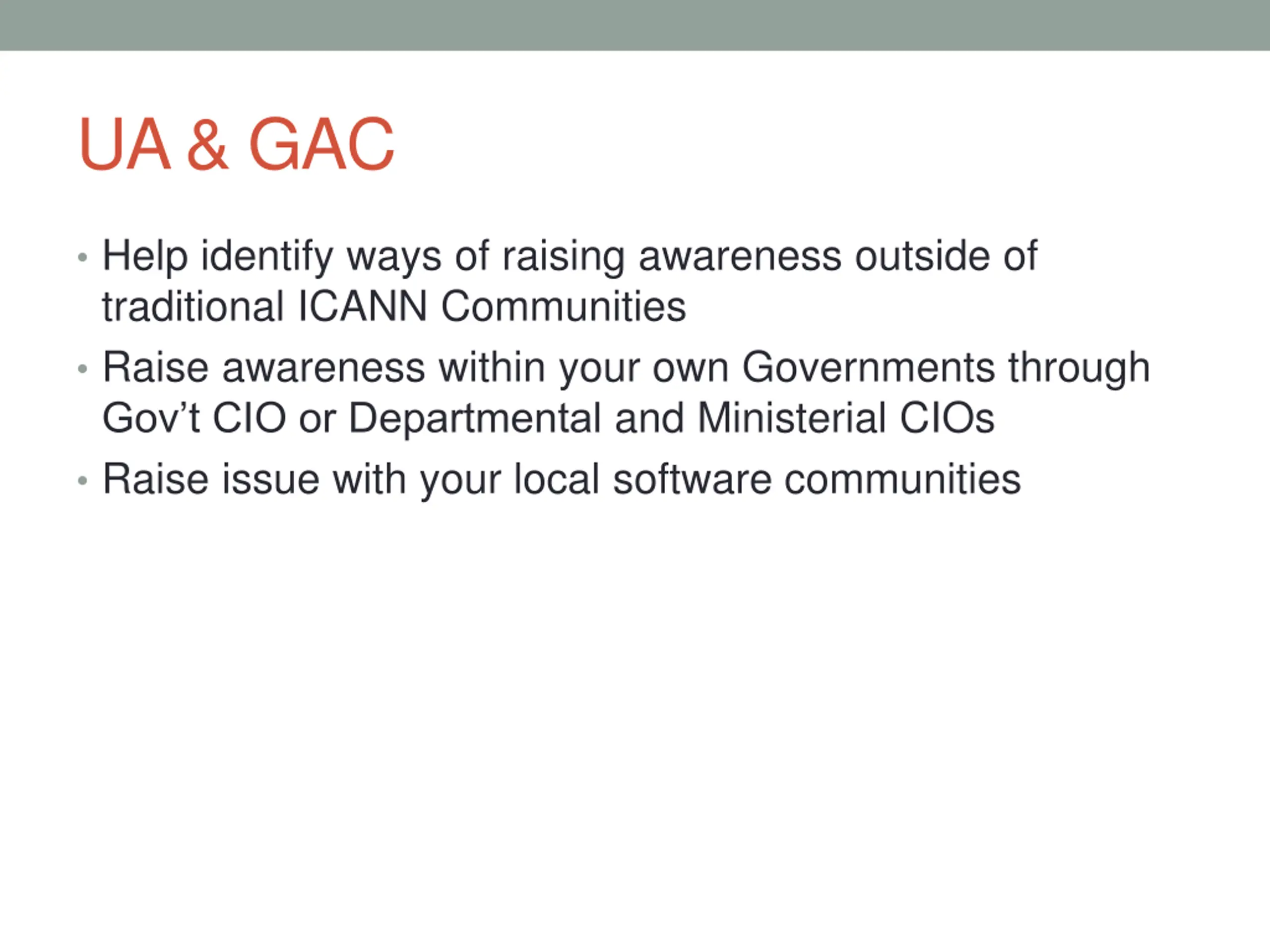 UA & GAC Help identify ways of raising awareness outside of traditional ICANN Communities Raise awareness within your own Governments through Gov t CIO or Departmental and Ministerial CIOs Raise issue with your local software communities