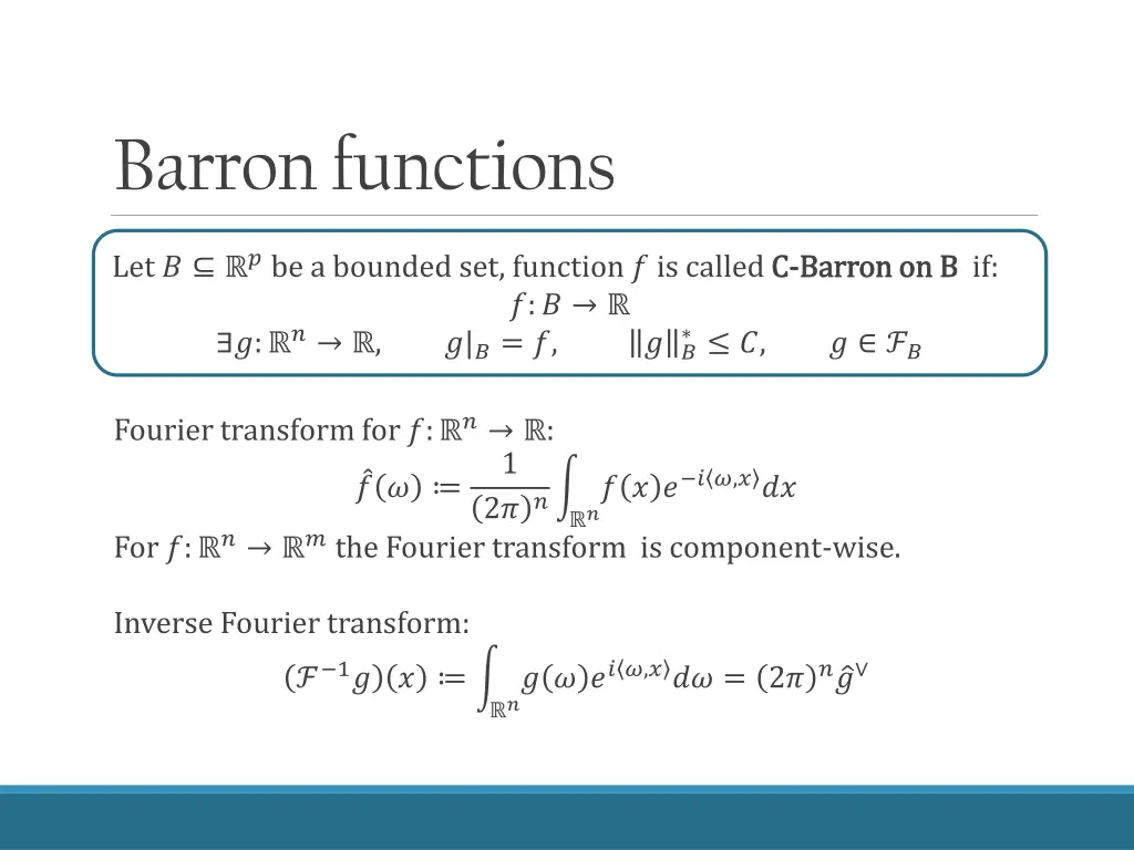 Barron functions Let ? ? be a bounded set, function ? is called C C- -Barron Barron on B on B if: ?:? ?, ?: ? , ?|?= ?, ?? ? ? Fourier transform for ?: ? : 1 ? ? ? ? ? ? ?,??? 2?? ? For ?: ? ? the Fourier transform is component-wise. Inverse Fourier transform: 1? ? ? ? ?? ?,??? = 2?? ? ?