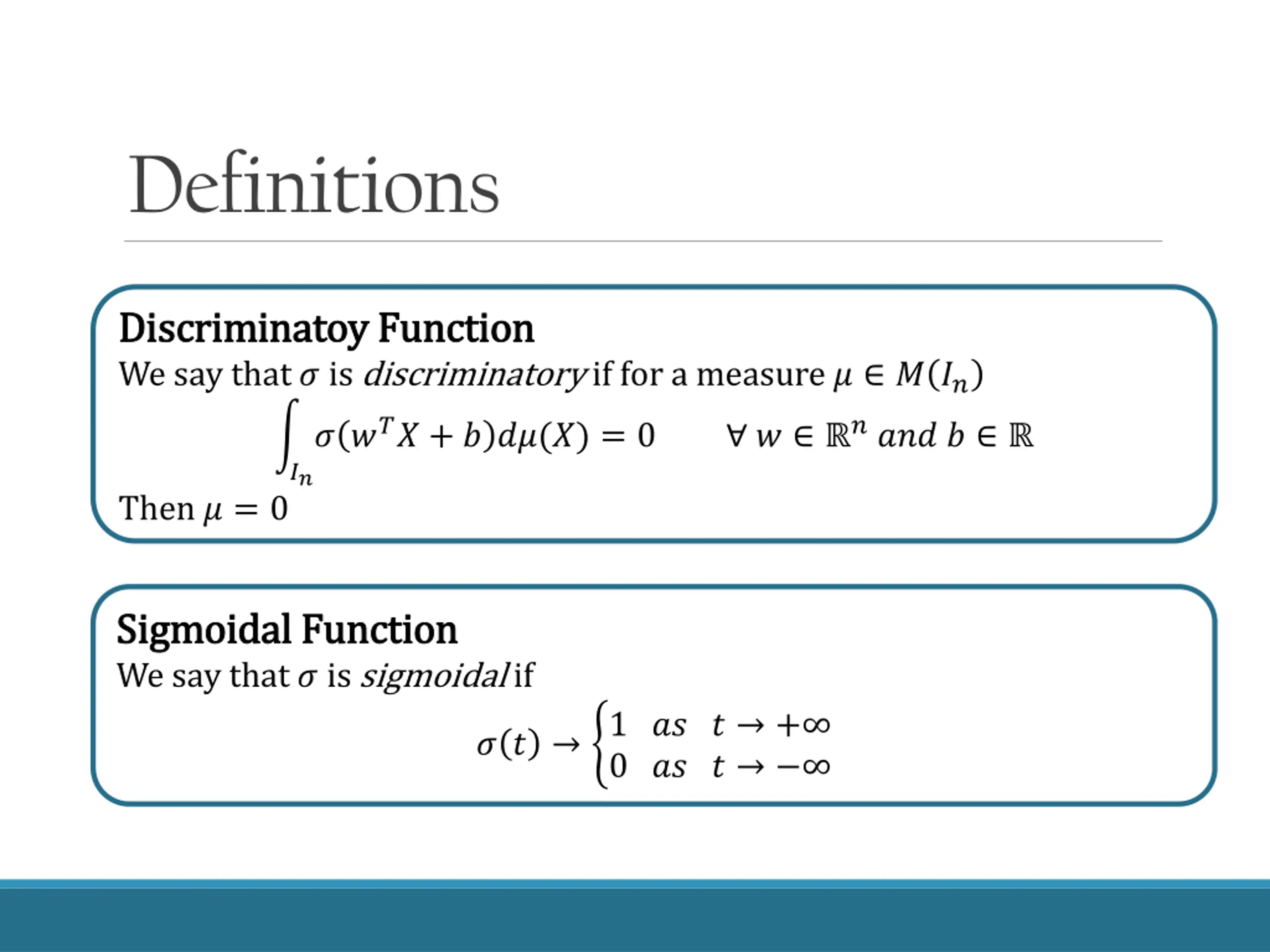 Definitions Discriminatoy Function Discriminatoy Function We say that ? is discriminatory if for a measure ? ? ?? ? ??? + ? ??(?) = 0 ? ? ??? ? ?? Then ? = 0 Sigmoidal Function Sigmoidal Function We say that ? is sigmoidal if ? ? 1 ?? ? + 0 ?? ?