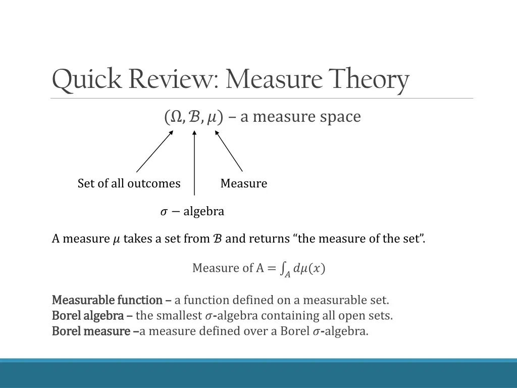 Quick Review: Measure Theory ( , ,?) a measure space Set of all outcomes Measure ? algebra A measure ? takes a set from and returns the measure of the set . Measure of A = ???(?) Measurable function Measurable function a function defined on a measurable set. Borel Borel algebra algebra the smallest ?- -algebra containing all open sets. Borel Borel measure measure a measure defined over a Borel ?- -algebra.