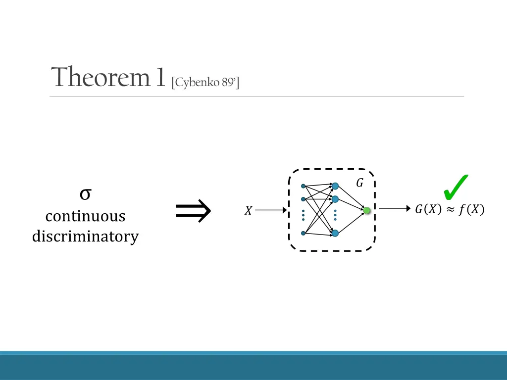 Theorem 1 [Cybenko 89] Let ? be any continuous discriminatory function. Then finite sums of the form: ? ?? + ??) G X = ?=1 ???(?? are dense in ?(??). In other words, given any ? ?(??) and ? > ?, there is a sum, ?(?), of the above form, for which ? ? ? ? < ?