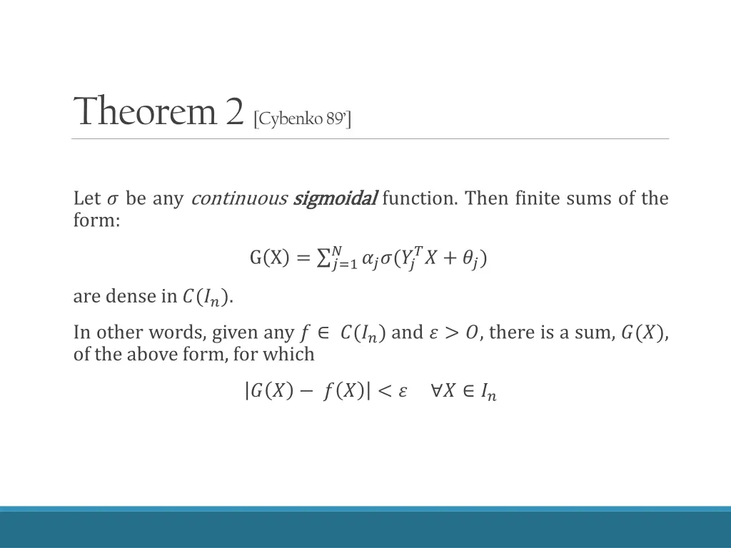 Theorem 2 [Cybenko 89] Let ? be any continuous sigmoidal form: sigmoidal function. Then finite sums of the ? ???(???? + ??) G X = ?=1 are dense in ?(??). In other words, given any ? ?(??) and ? > ?, there is a sum, ?(?), of the above form, for which ? ? ? ? < ? ? ??