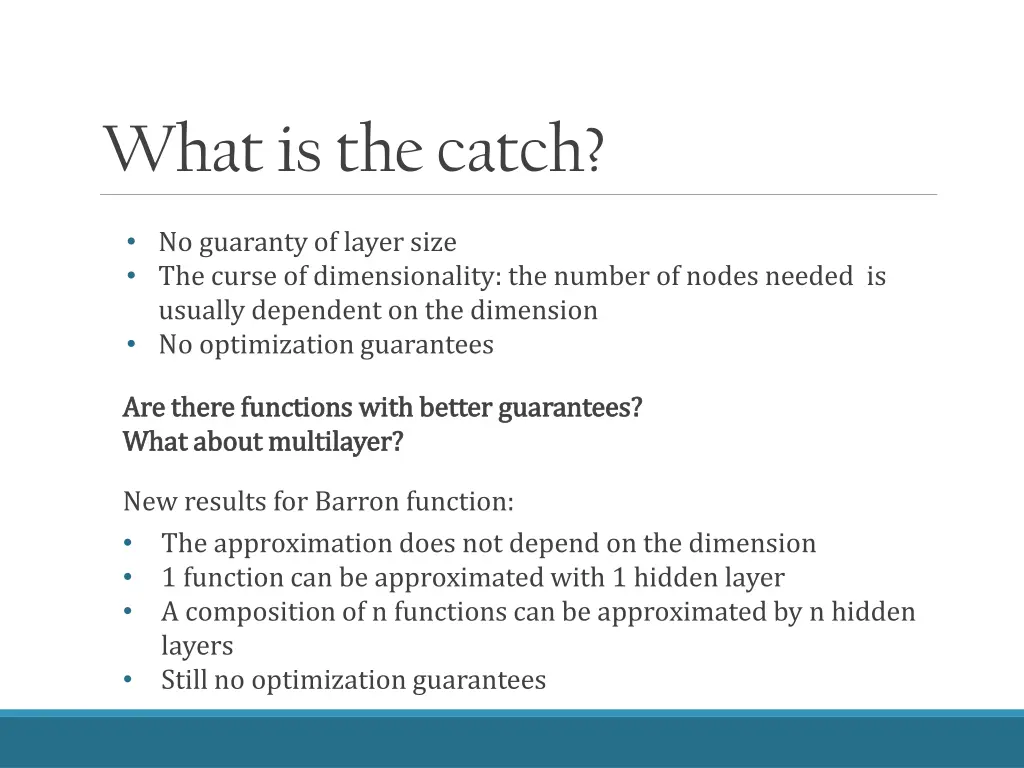 What is the catch? No guaranty of layer size The curse of dimensionality: the number of nodes needed is usually dependent on the dimension No optimization guarantees Are there functions with better guarantees? Are there functions with better guarantees? What about multilayer? What about multilayer? New results for Barron function: The approximation does not depend on the dimension 1 function can be approximated with 1 hidden layer A composition of n functions can be approximated by n hidden layers Still no optimization guarantees