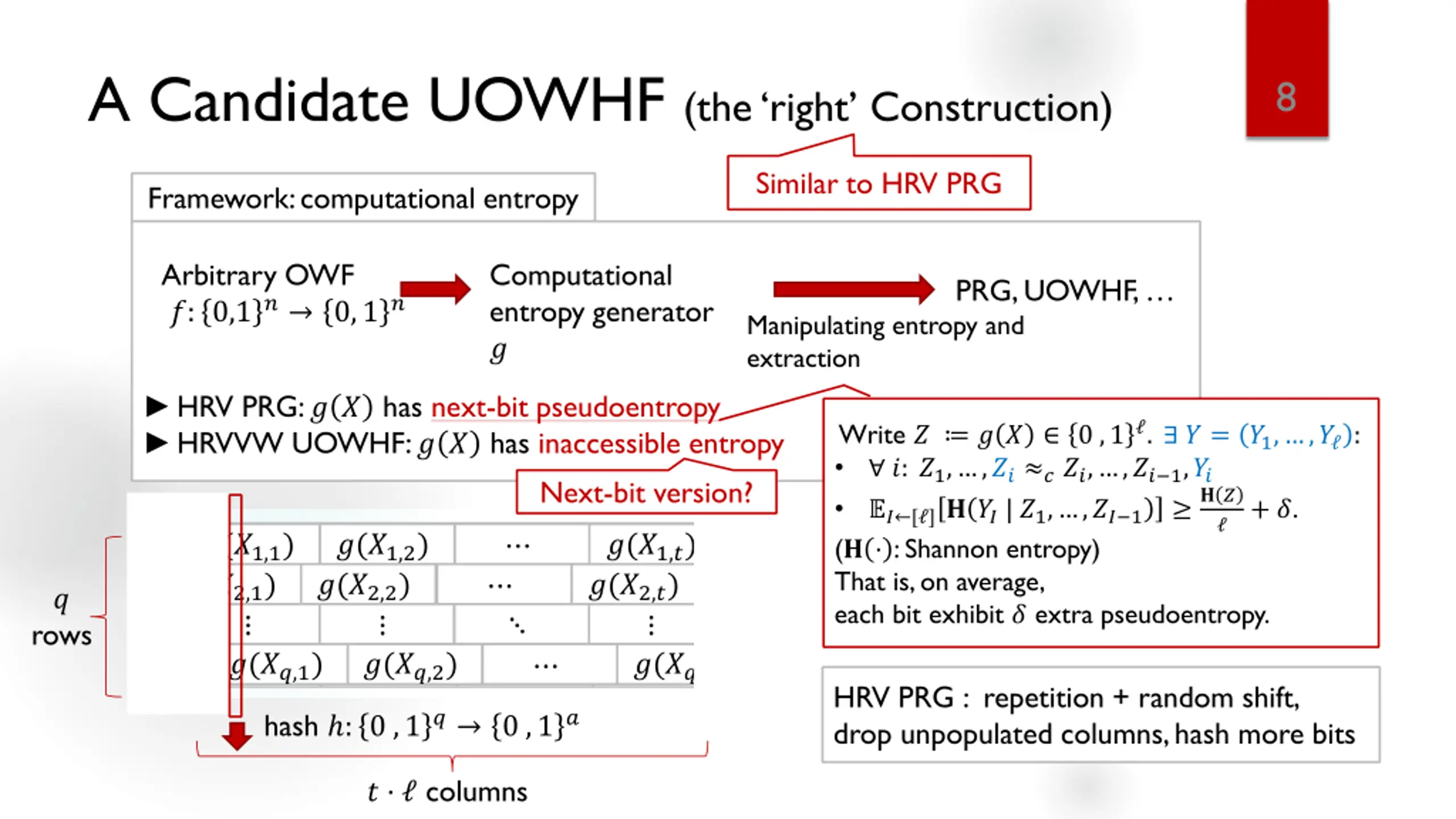 A Candidate UOWHF (the right Construction) 8 Similar to HRV PRG Framework: computational entropy Arbitrary OWF ?: 0,1? 0,1? Computational entropy generator ? PRG, UOWHF, Manipulating entropy and extraction HRV PRG: ? ? has next-bit pseudoentropy HRVVW UOWHF: ? ? has inaccessible entropy Write ? ? ? 0 ,1 . ? = ?1, ,? : ?: ?1, ,?? ???, ,?? 1,?? ?? [ ]? ?? | ?1, ,?? 1 (? : Shannon entropy) That is, on average, each bit exhibit ?extra pseudoentropy. Next-bit version? ? ? + ?. ?(?1,1) ?(?2,1) ?(?1,2) ?(?2,2) ?(?1,?) ?(?2,?) ? rows ?(??,1) ?(??,2) ?(??,?) HRV PRG : repetition + random shift, drop unpopulated columns, hash more bits hash : 0 ,1? 0 ,1? ? columns