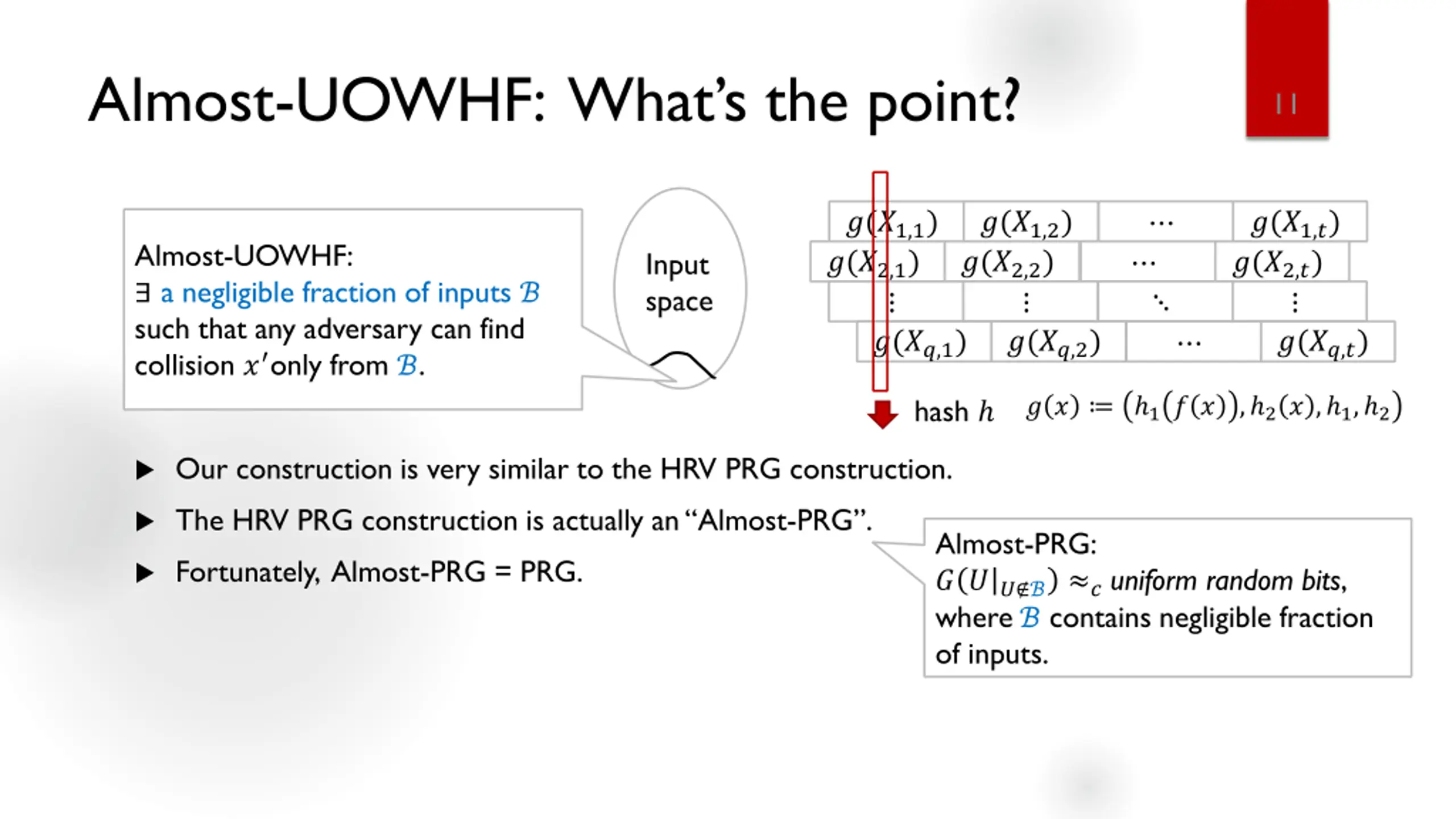 Almost-UOWHF: Whats the point? 11 ?(?1,1) ?(?2,1) ?(?1,2) ?(?2,2) ?(?1,?) ?(?2,?) Almost-UOWHF: a negligible fraction of inputs such that any adversary can find collision ? only from . Input space ?(??,1) ?(??,2) ?(??,?) hash ? ? 1? ? , 2? , 1, 2 Our construction is very similar to the HRV PRG construction. The HRV PRG construction is actually an Almost-PRG . Almost-PRG: ? ?|? ?uniform random bits, where contains negligible fraction of inputs. Fortunately, Almost-PRG = PRG.