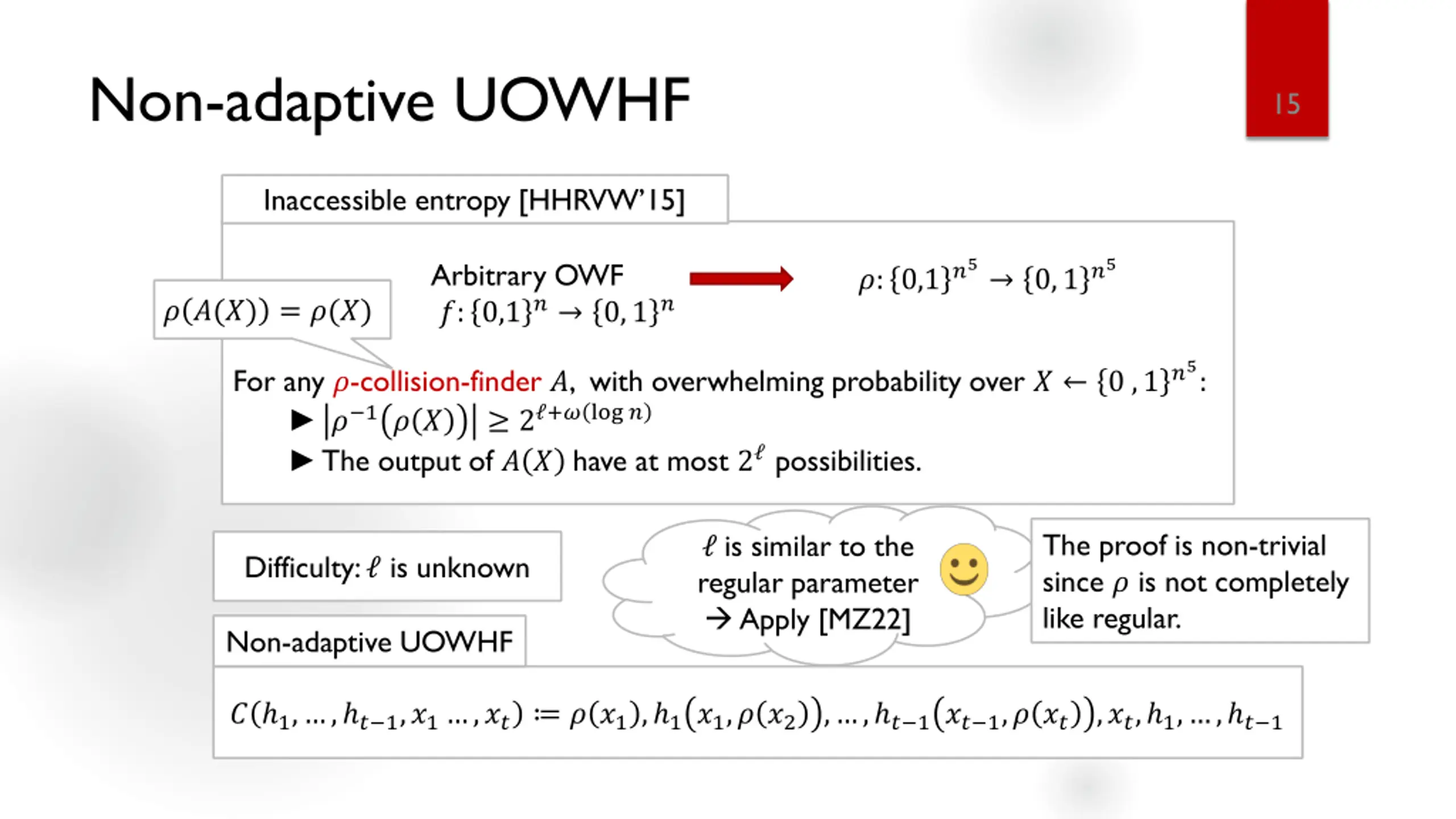 Non-adaptive UOWHF 15 Inaccessible entropy [HHRVW 15] ?: 0,1?5 0,1?5 Arbitrary OWF ?: 0,1? 0,1? ? ?(?) = ?(?) For any ?-collision-finder ?, with overwhelming probability over ? 0 ,1?5: ? 1? ? 2 +? log ? The output of ? ? have at most 2 possibilities. The proof is non-trivial since ? is not completely like regular. is similar to the regular parameter Apply [MZ22] Difficulty: is unknown Non-adaptive UOWHF ? 1, , ? 1,?1 ,?? ? ?1, 1?1,? ?2 , , ? 1?? 1,? ?? ,??, 1, , ? 1