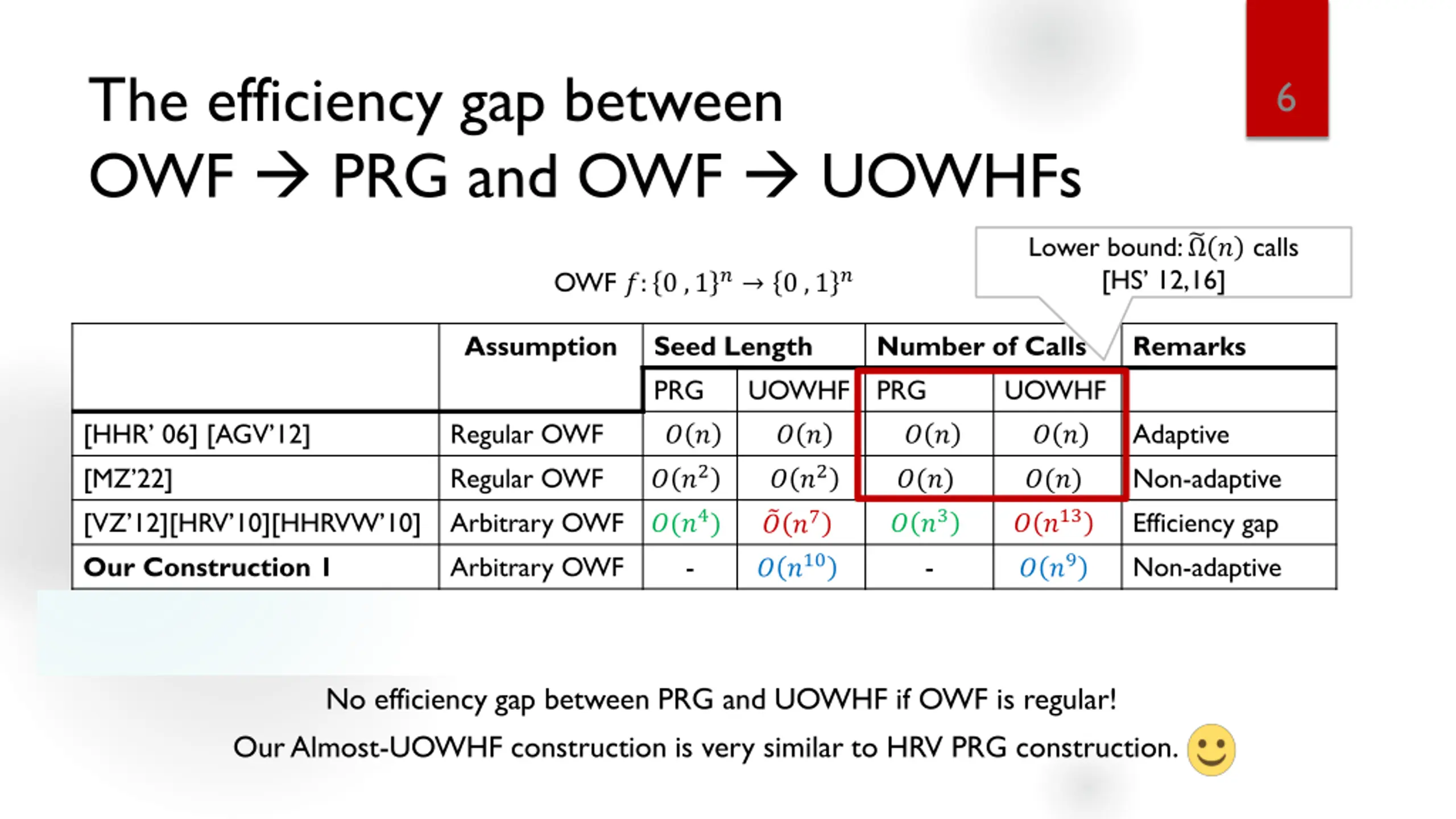 The concept of Universal One-Way Hash Functions (UOWHFs) and their efficiency measures, including seed length and number of calls, are explored in this academic paper. It delves into the construction of UOWHFs from regular OWFs and the similarities between OWFs, Pseudo-Random Generators (PRGs), and UOWHFs. The efficiency gap between PRGs and UOWHFs is analyzed, highlighting the distinction between adaptive and non-adaptive constructions.