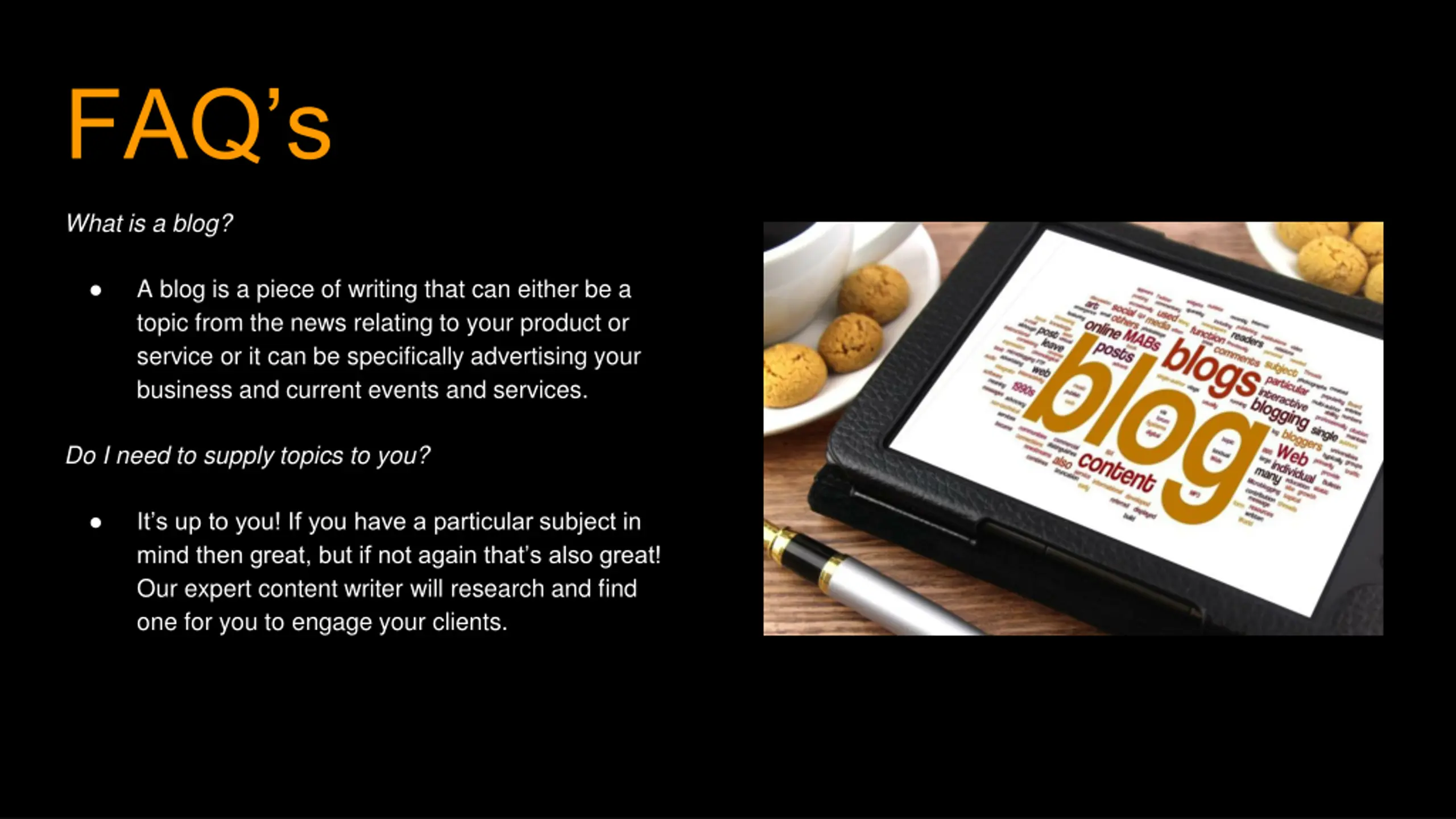 FAQs What is a blog? A blog is a piece of writing that can either be a topic from the news relating to your product or service or it can be specifically advertising your business and current events and services. Do I need to supply topics to you? It s up to you! If you have a particular subject in mind then great, but if not again that s also great! Our expert content writer will research and find one for you to engage your clients.