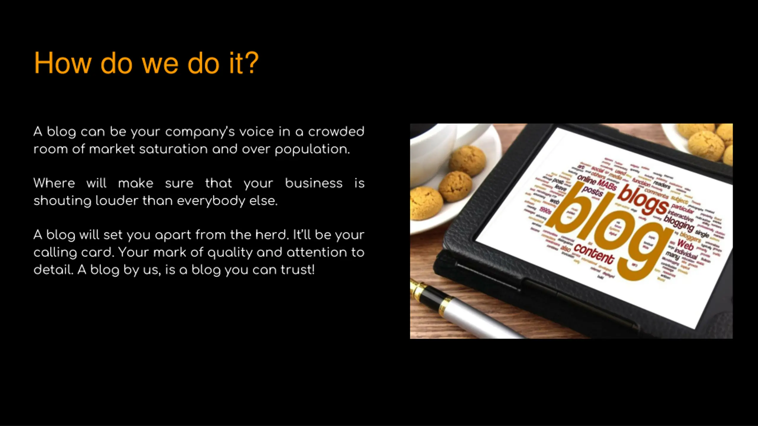 How do we do it? A blog can be your company s voice in a crowded room of market saturation and over population. Where will make sure shouting louder than everybody else. that your business is A blog will set you apart from the herd. It ll be your calling card. Your mark of quality and attention to detail. A blog by us, is a blog you can trust!
