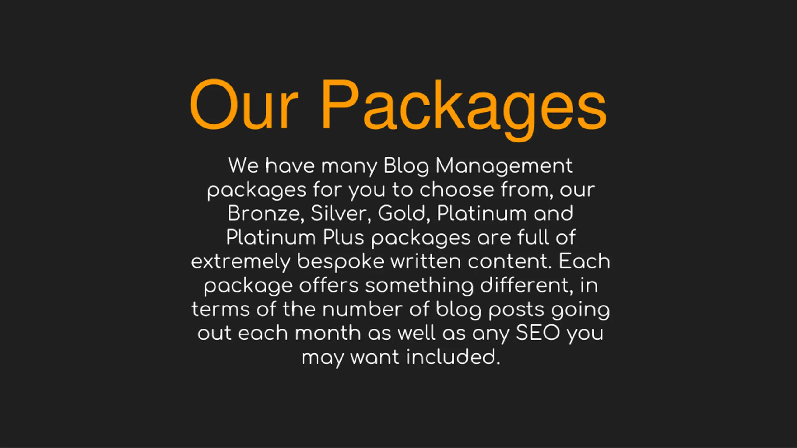 Our Packages We have many Blog Management packages for you to choose from, our Bronze, Silver, Gold, Platinum and Platinum Plus packages are full of extremely bespoke written content. Each package offers something different, in terms of the number of blog posts going out each month as well as any SEO you may want included.