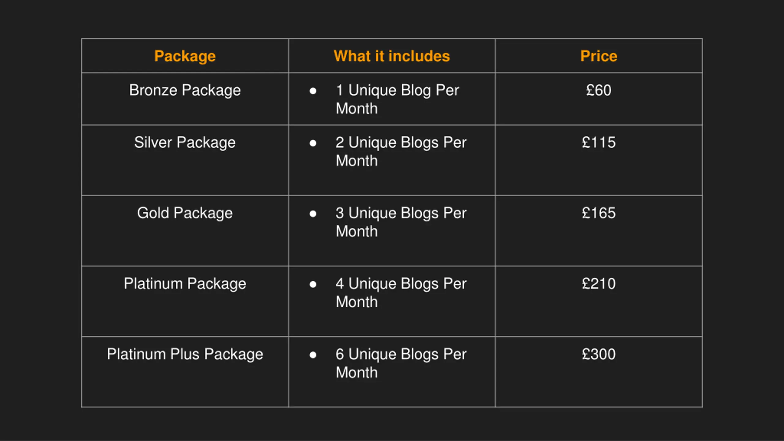 Package What it includes Price Bronze Package 1 Unique Blog Per Month 60 Silver Package 2 Unique Blogs Per Month 115 Gold Package 3 Unique Blogs Per Month 165 Platinum Package 4 Unique Blogs Per Month 210 Platinum Plus Package 6 Unique Blogs Per Month 300