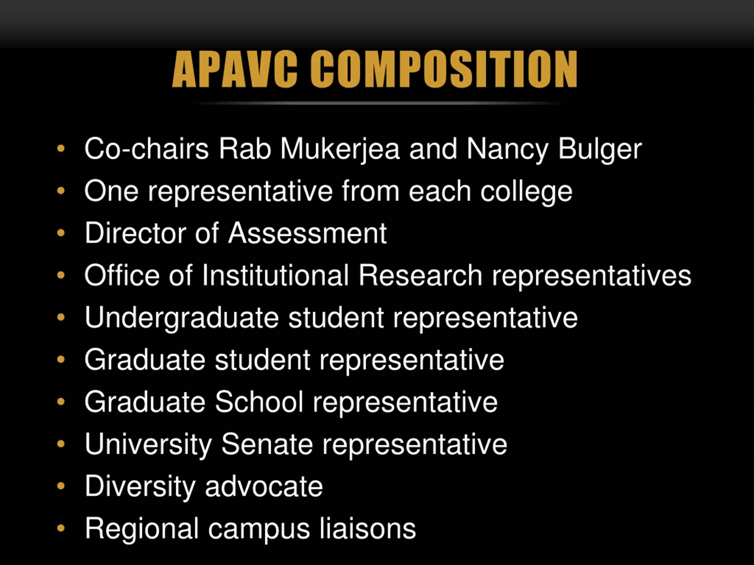 APAVC COMPOSITION Co-chairs Rab Mukerjea and Nancy Bulger One representative from each college Director of Assessment Office of Institutional Research representatives Undergraduate student representative Graduate student representative Graduate School representative University Senate representative Diversity advocate Regional campus liaisons