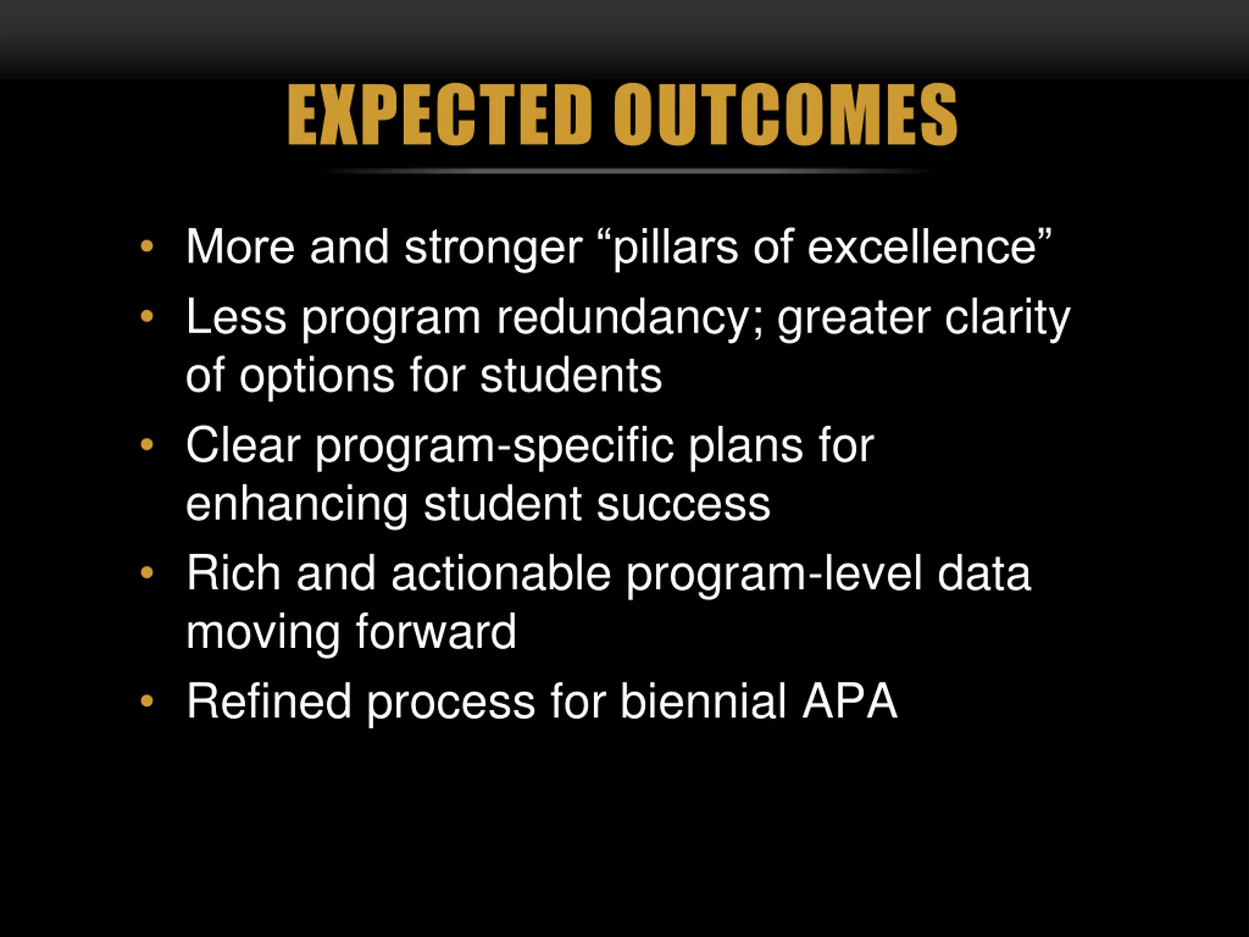 EXPECTED OUTCOMES More and stronger pillars of excellence Less program redundancy; greater clarity of options for students Clear program-specific plans for enhancing student success Rich and actionable program-level data moving forward Refined process for biennial APA