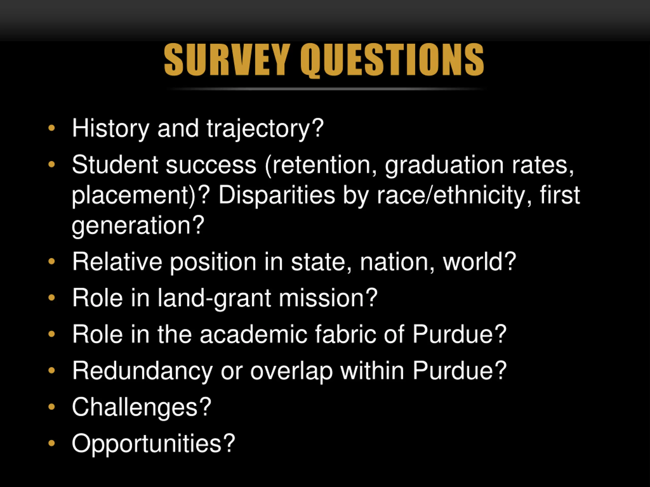 SURVEY QUESTIONS History and trajectory? Student success (retention, graduation rates, placement)? Disparities by race/ethnicity, first generation? Relative position in state, nation, world? Role in land-grant mission? Role in the academic fabric of Purdue? Redundancy or overlap within Purdue? Challenges? Opportunities?