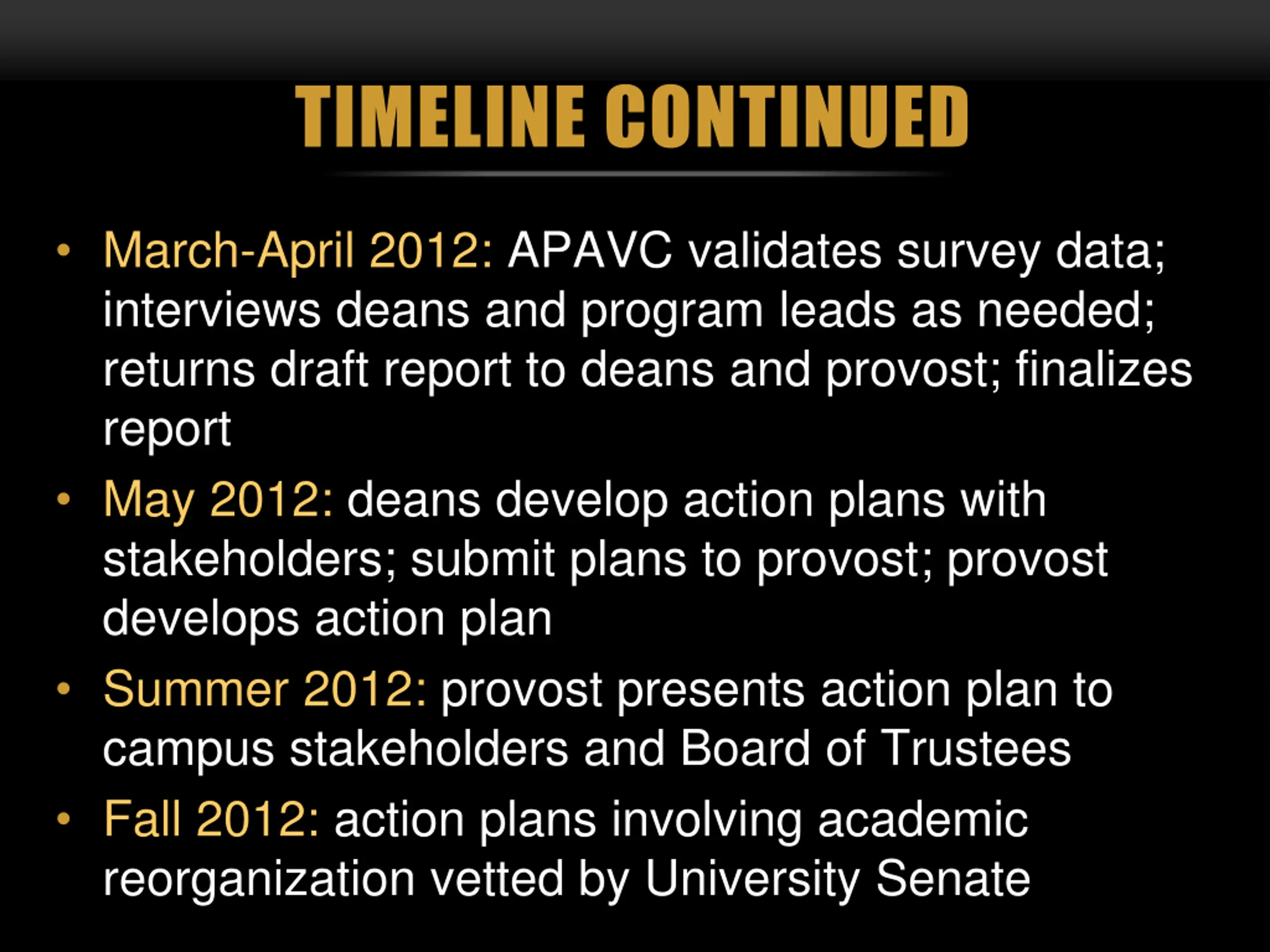 TIMELINE CONTINUED March-April 2012: APAVC validates survey data; interviews deans and program leads as needed; returns draft report to deans and provost; finalizes report May 2012: deans develop action plans with stakeholders; submit plans to provost; provost develops action plan Summer 2012: provost presents action plan to campus stakeholders and Board of Trustees Fall 2012: action plans involving academic reorganization vetted by University Senate