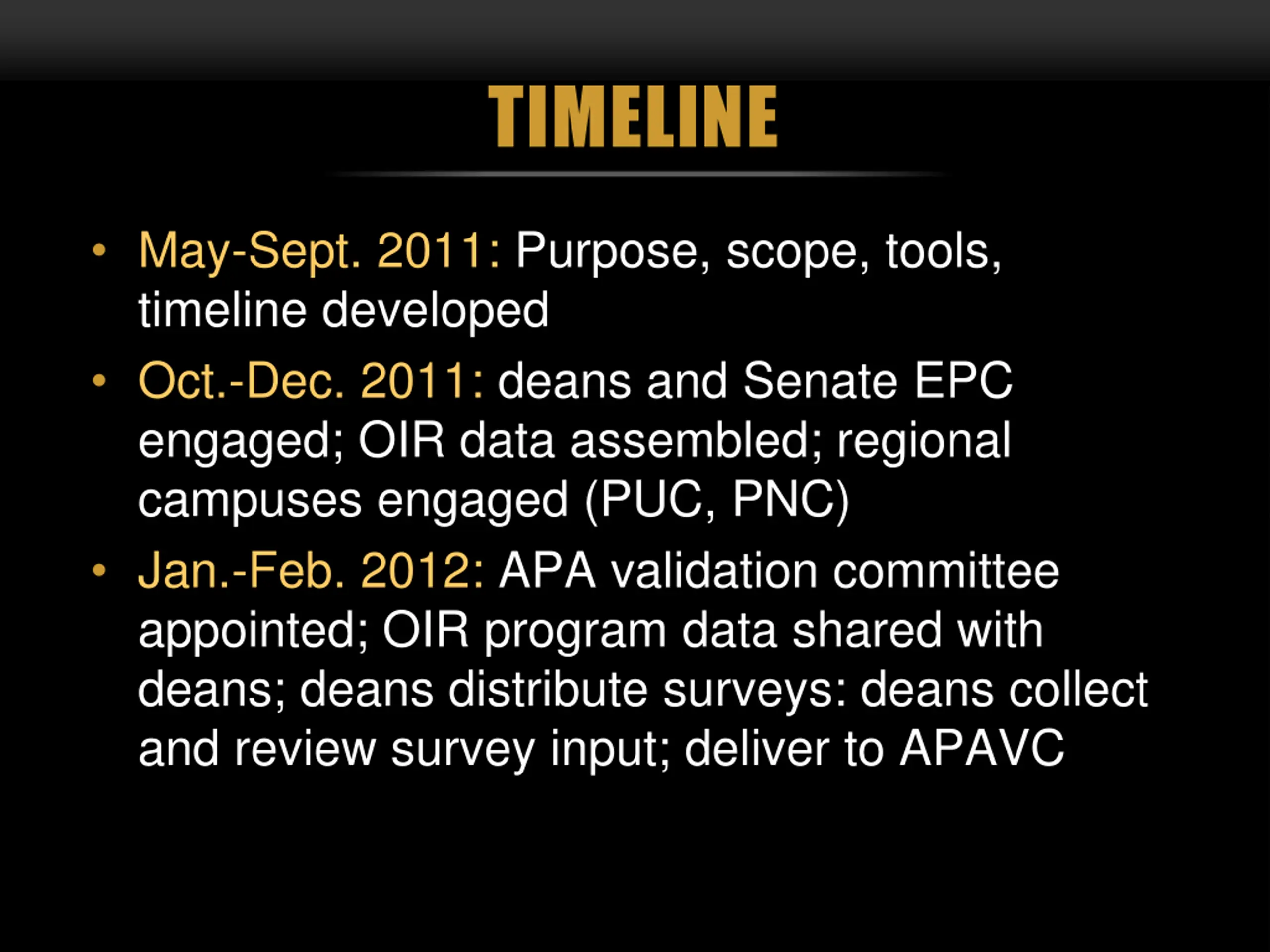 TIMELINE May-Sept. 2011: Purpose, scope, tools, timeline developed Oct.-Dec. 2011: deans and Senate EPC engaged; OIR data assembled; regional campuses engaged (PUC, PNC) Jan.-Feb. 2012: APA validation committee appointed; OIR program data shared with deans; deans distribute surveys: deans collect and review survey input; deliver to APAVC