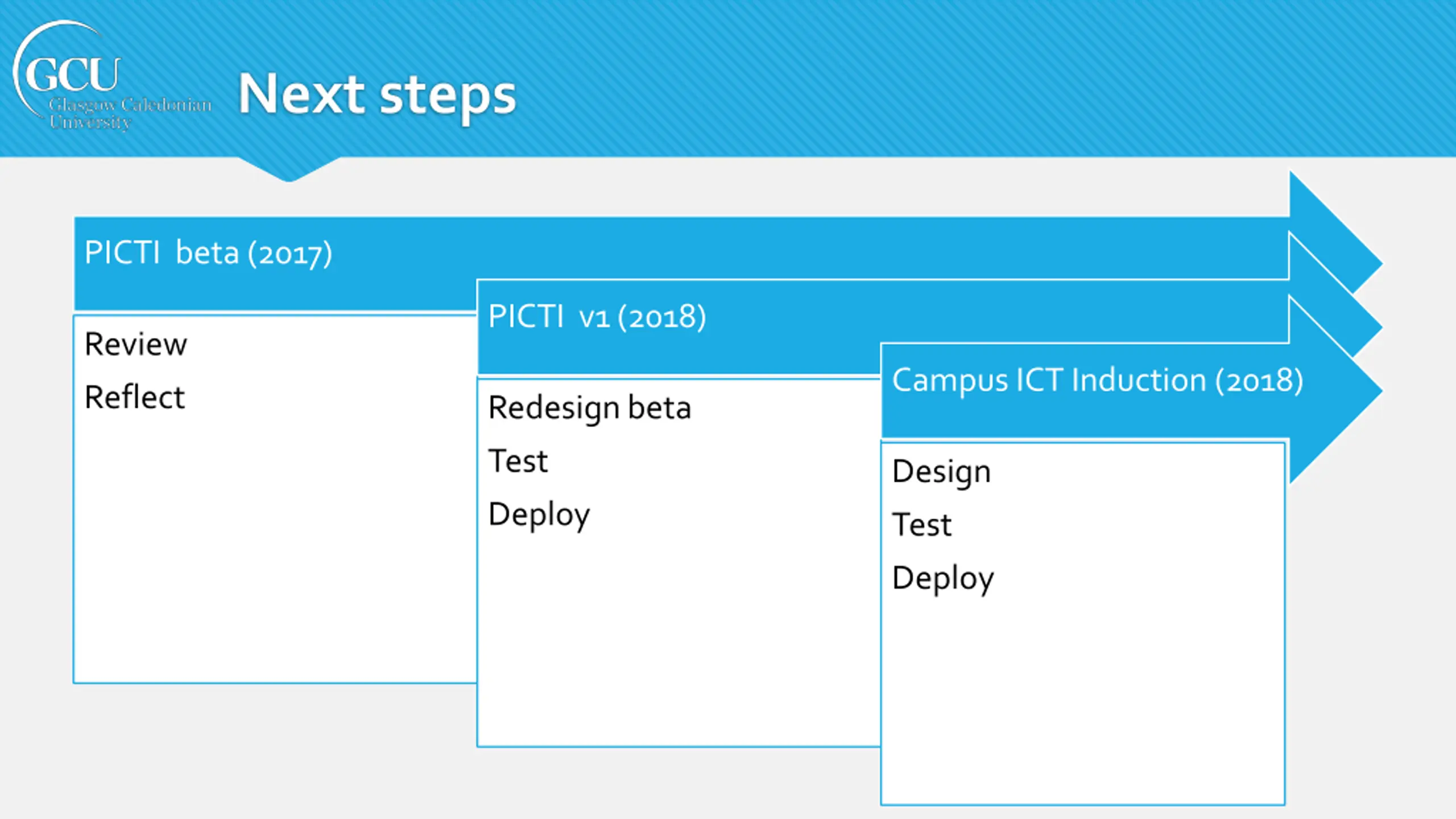 Next steps PICTI beta (2017) PICTI v1 (2018) Review Campus ICT Induction (2018) Reflect Redesign beta Test Design Deploy Test Deploy