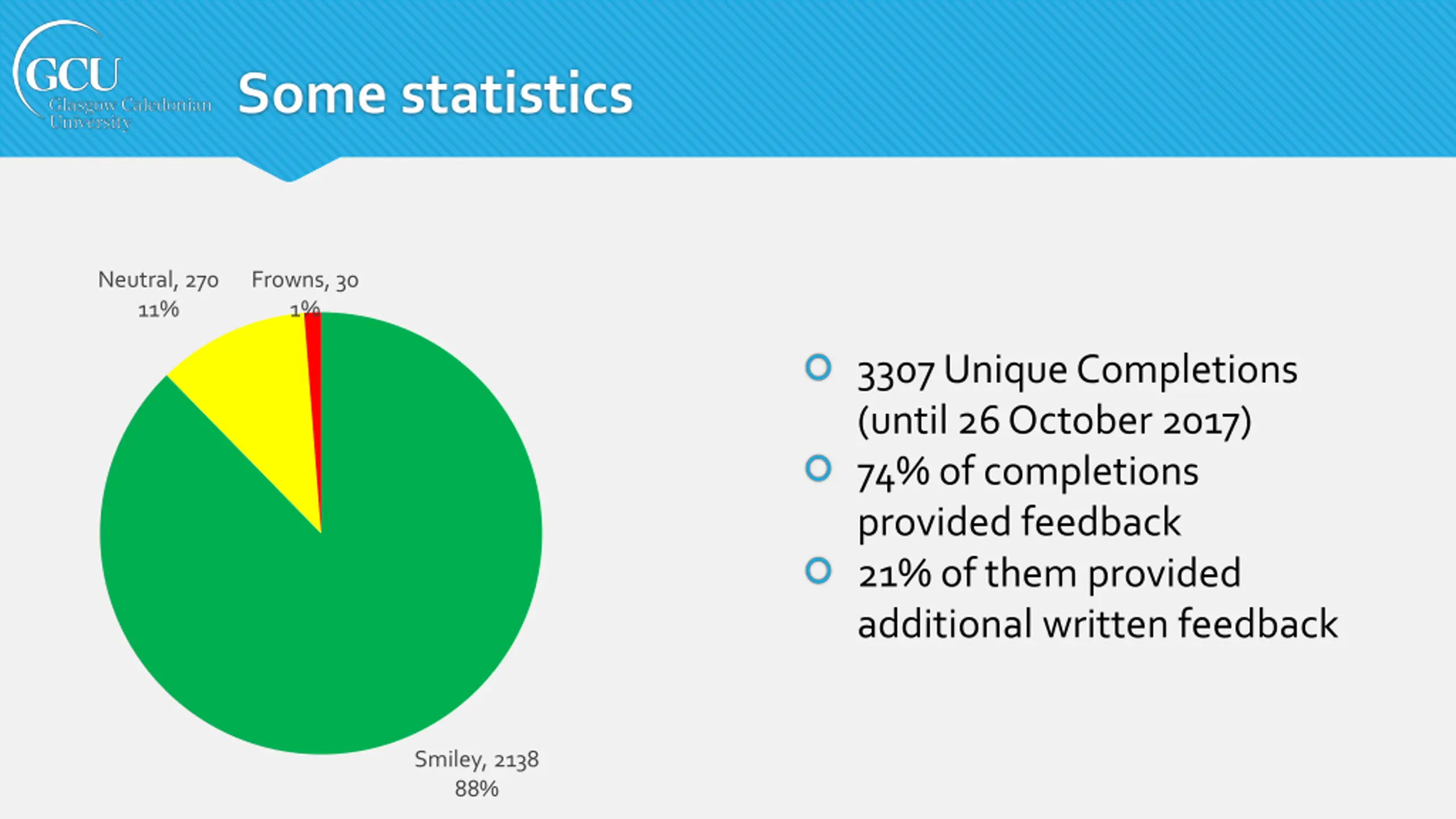 Some statistics Neutral, 270 11% Frowns, 30 1% 3307 Unique Completions (until 26 October 2017) 74% of completions provided feedback 21% of them provided additional written feedback Smiley, 2138 88%