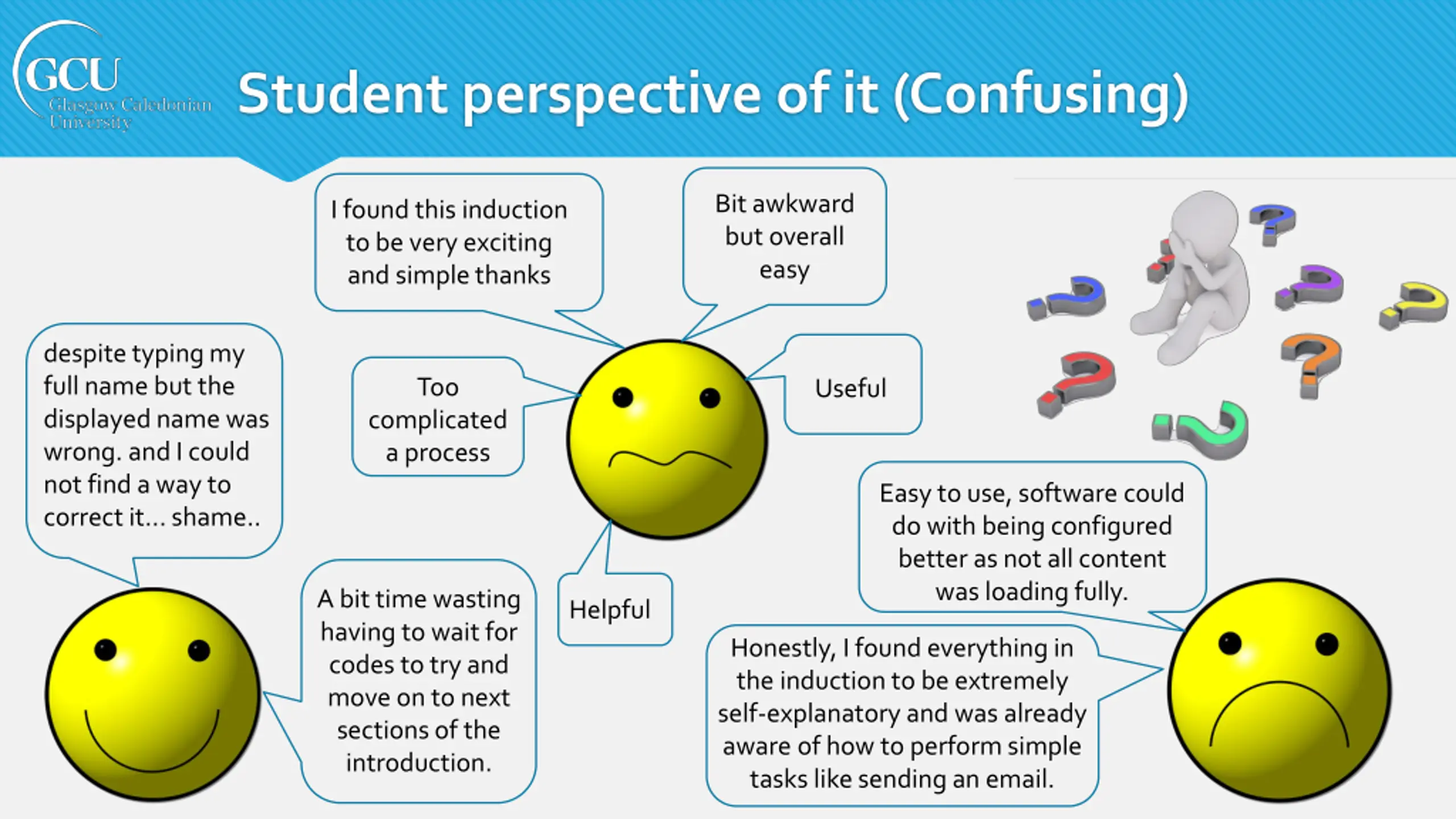 Student perspective of it (Confusing) Bit awkward but overall easy I found this induction to be very exciting and simple thanks despite typing my full name but the displayed name was wrong. and I could not find a way to correct it... shame.. Too Useful complicated a process Easy to use, software could do with being configured better as not all content was loading fully. A bit time wasting having to wait for codes to try and move on to next sections of the introduction. Helpful Honestly, I found everything in the induction to be extremely self-explanatory and was already aware of how to perform simple tasks like sending an email.