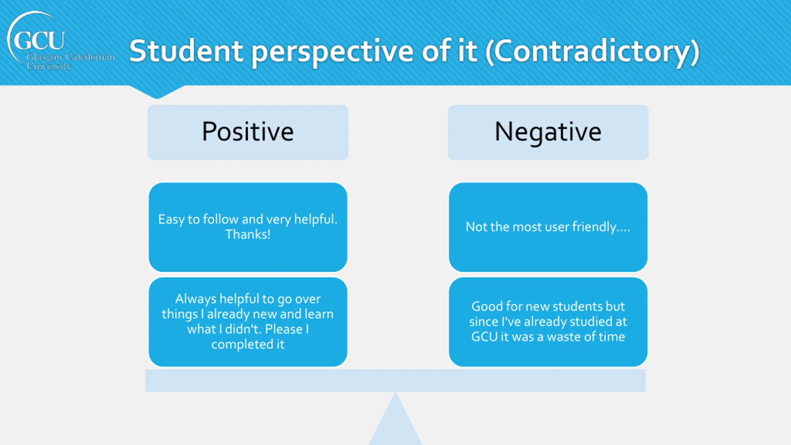 Student perspective of it (Contradictory) Positive Negative Easy to follow and very helpful. Thanks! Not the most user friendly.... Always helpful to go over things I already new and learn what I didn't. Please I completed it Good for new students but since I've already studied at GCU it was a waste of time