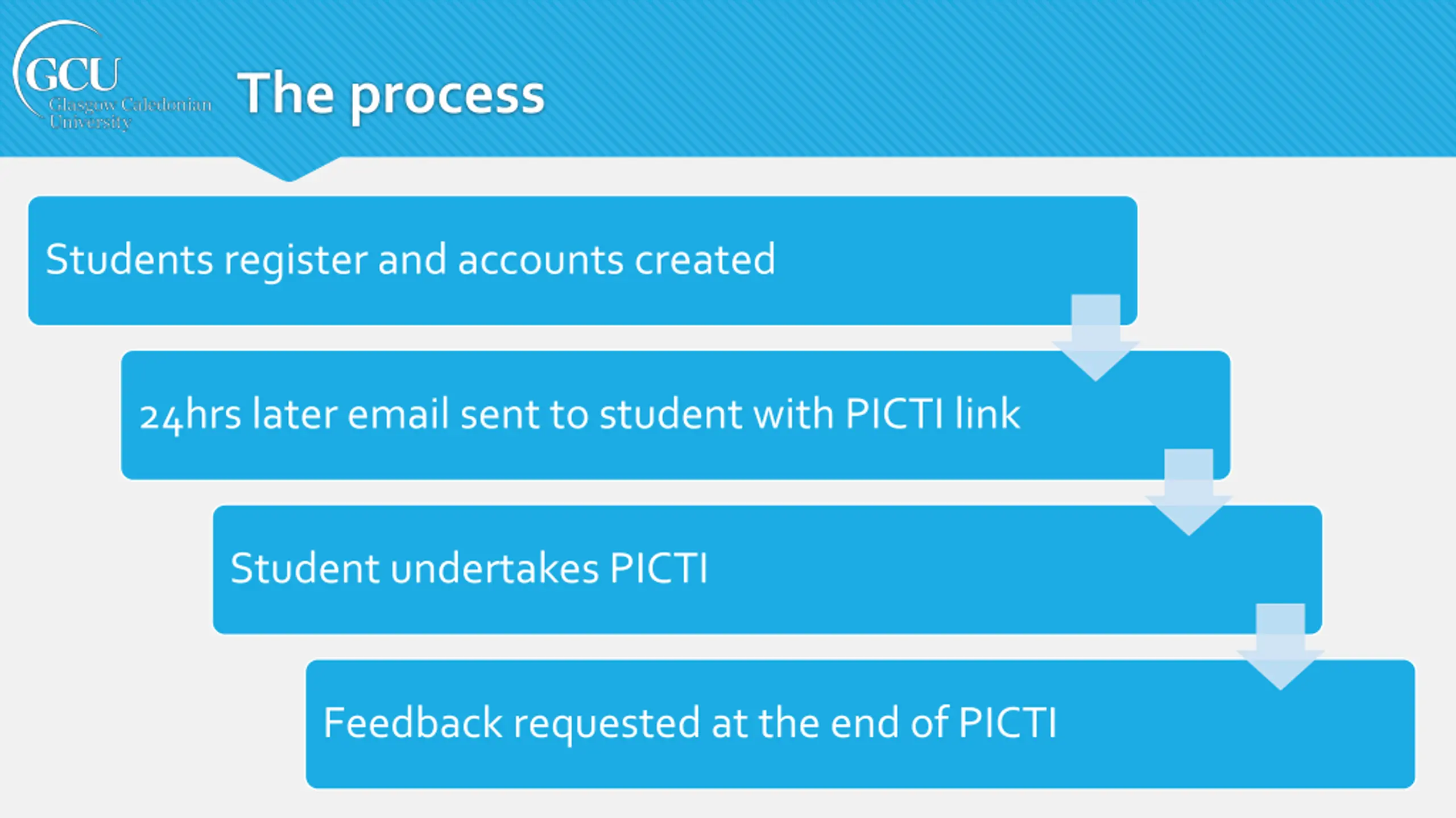 The process Students register and accounts created 24hrs later email sent to student with PICTI link Student undertakes PICTI Feedback requested at the end of PICTI