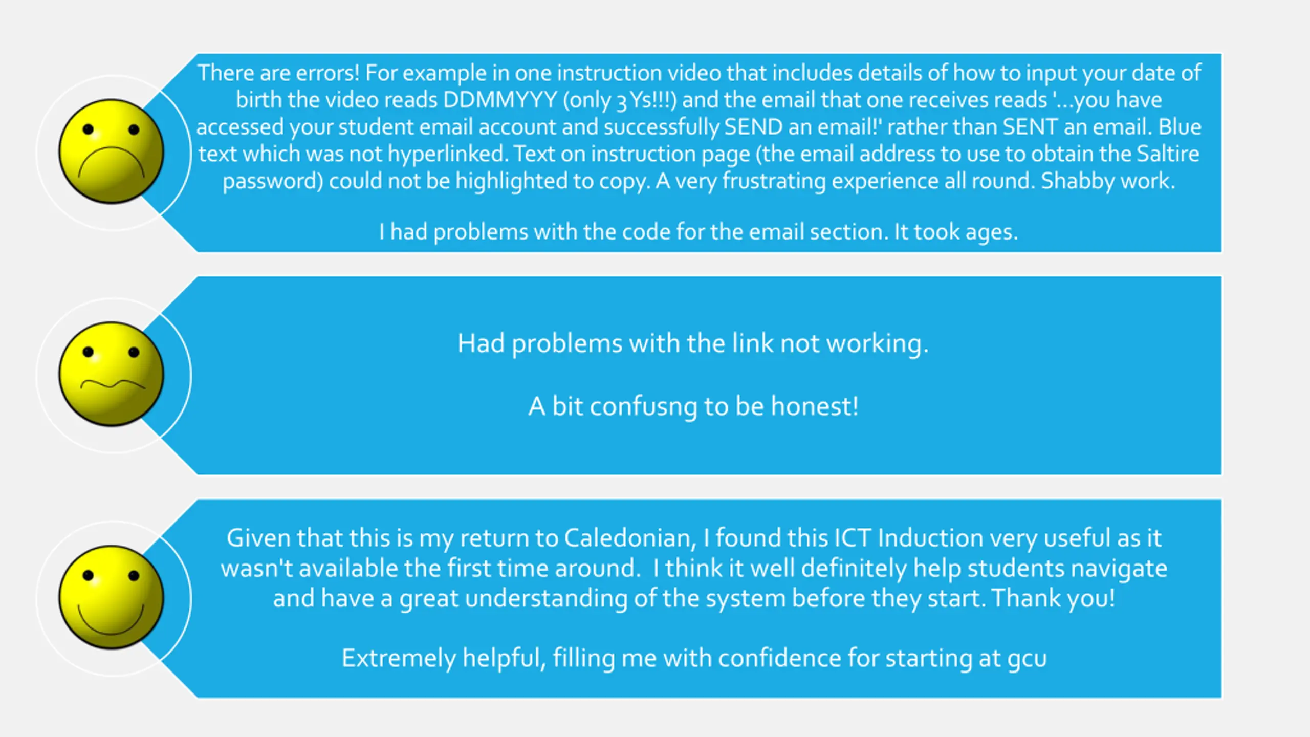 There are errors! For example in one instruction video that includes details of how to input your date of birth the video reads DDMMYYY (only 3 Ys!!!) and the email that one receives reads '...you have accessed your student email account and successfully SEND an email!' rather than SENT an email. Blue text which was not hyperlinked. Text on instruction page (the email address to use to obtain the Saltire password) could not be highlighted to copy. A very frustrating experience all round. Shabby work. I had problems with the code for the email section. It took ages. Had problems with the link not working. A bit confusng to be honest! Given that this is my return to Caledonian, I found this ICT Induction very useful as it wasn't available the first time around. I think it well definitely help students navigate and have a great understanding of the system before they start. Thank you! Extremely helpful, filling me with confidence for starting at gcu