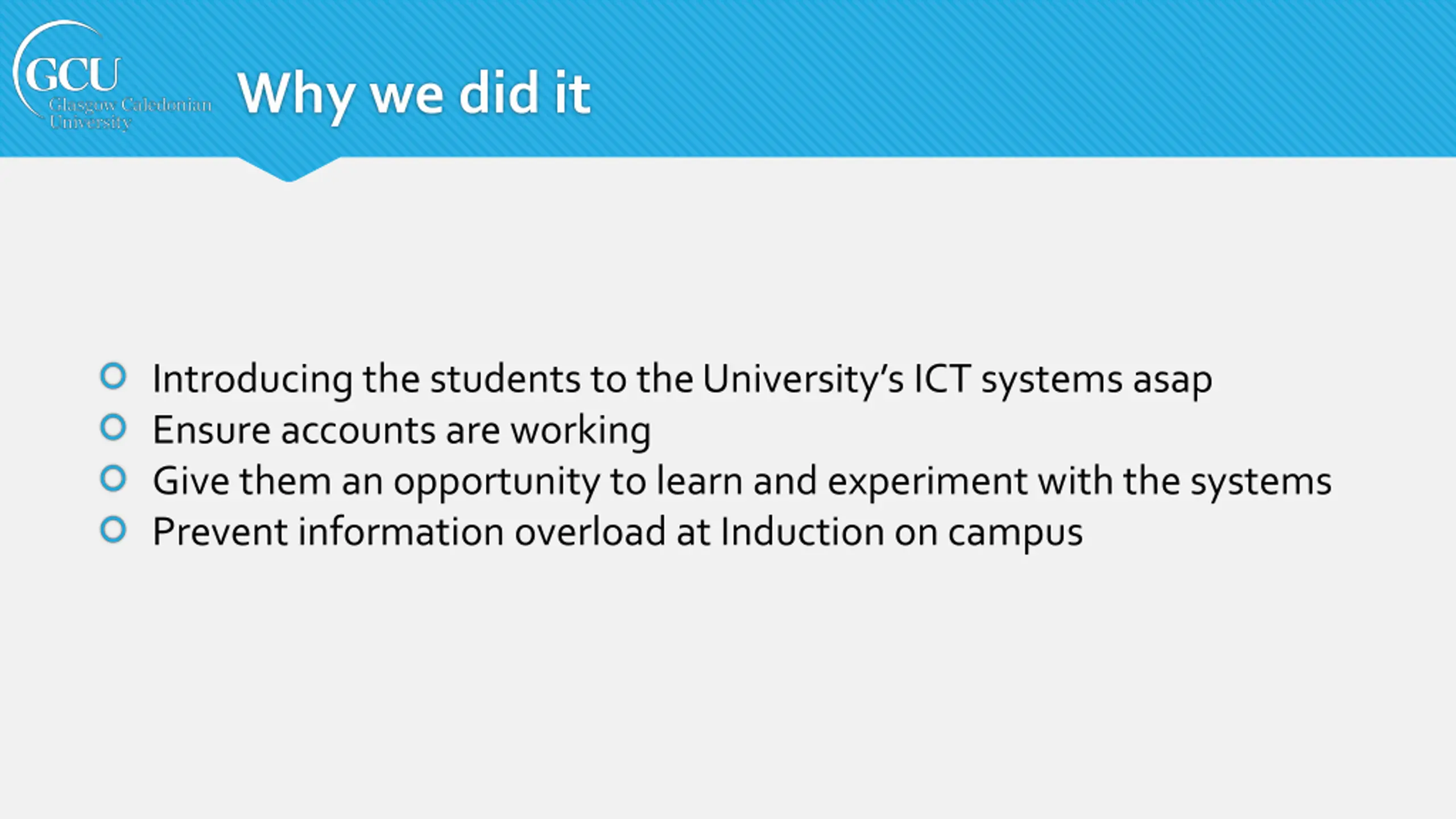 Why we did it Introducing the students to the University s ICT systems asap Ensure accounts are working Give them an opportunity to learn and experiment with the systems Prevent information overload at Induction on campus