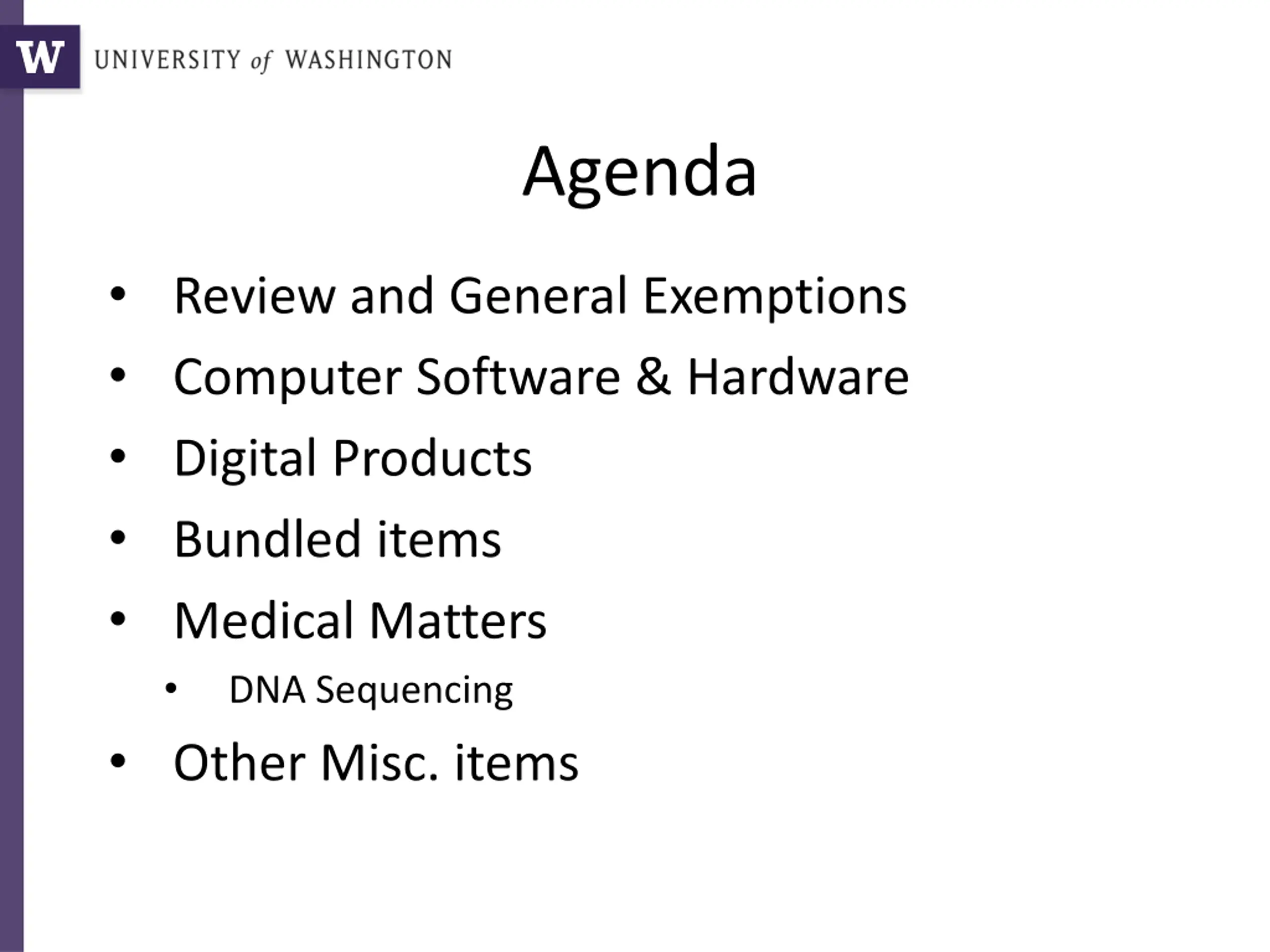 Agenda Review and General Exemptions Computer Software & Hardware Digital Products Bundled items Medical Matters DNA Sequencing Other Misc. items