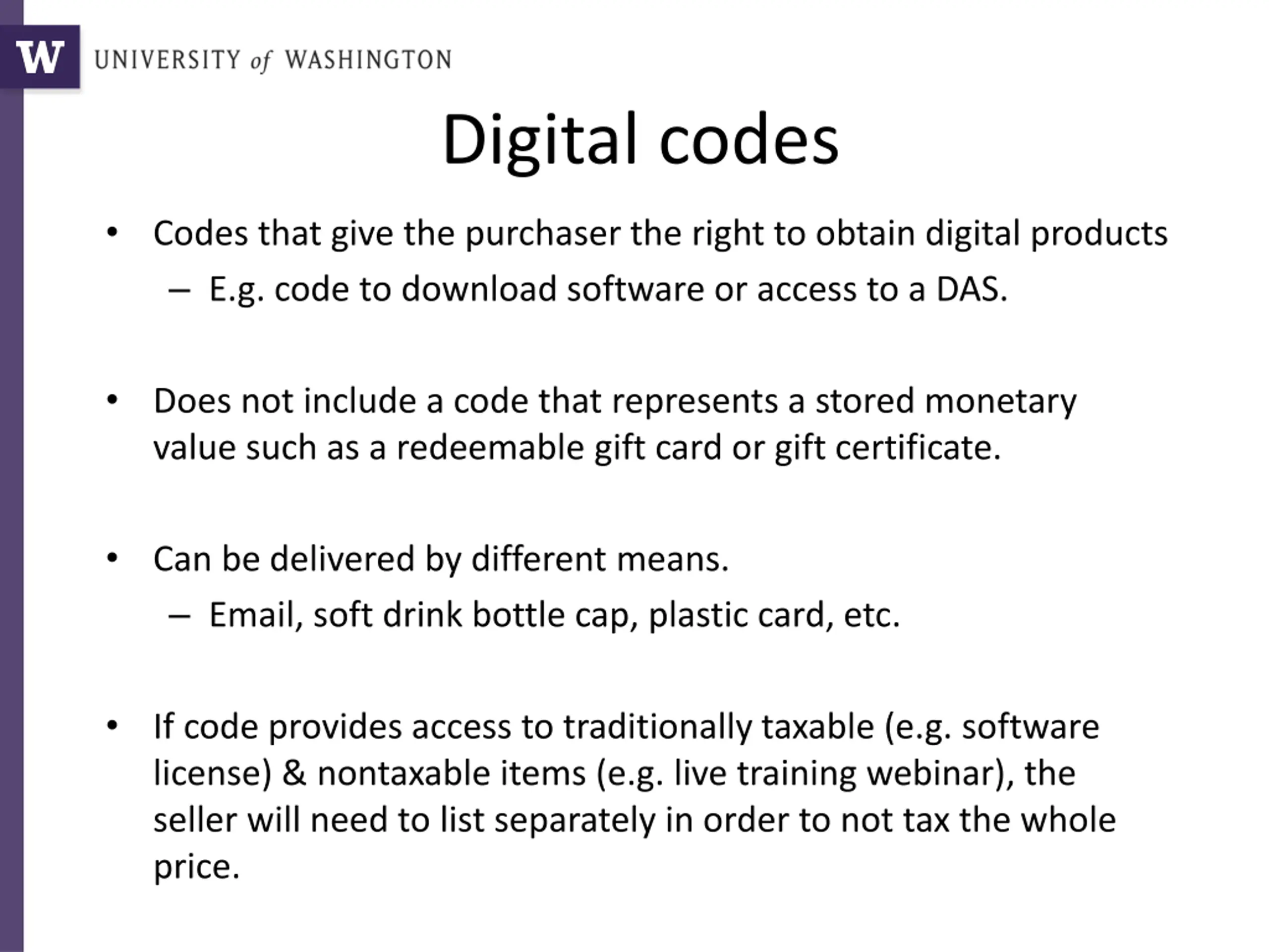 Digital codes Codes that give the purchaser the right to obtain digital products E.g. code to download software or access to a DAS. Does not include a code that represents a stored monetary value such as a redeemable gift card or gift certificate. Can be delivered by different means. Email, soft drink bottle cap, plastic card, etc. If code provides access to traditionally taxable (e.g. software license) & nontaxable items (e.g. live training webinar), the seller will need to list separately in order to not tax the whole price.