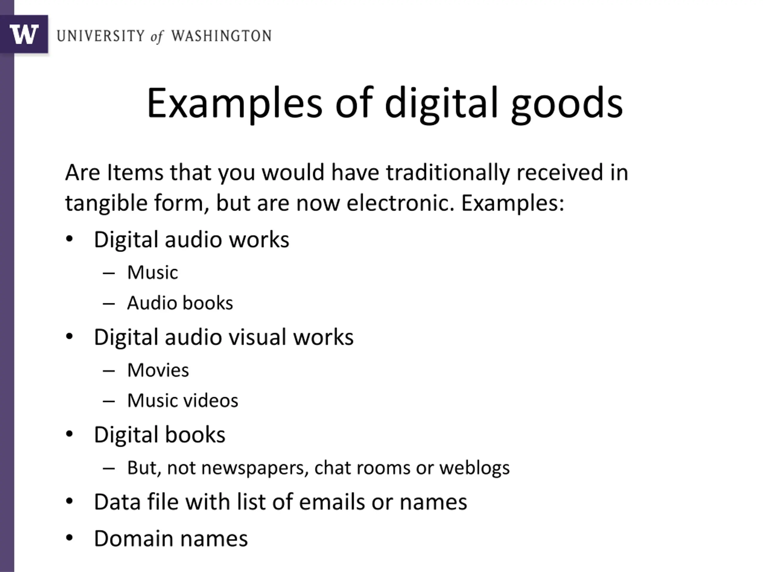 Examples of digital goods Are Items that you would have traditionally received in tangible form, but are now electronic. Examples: Digital audio works Music Audio books Digital audio visual works Movies Music videos Digital books But, not newspapers, chat rooms or weblogs Data file with list of emails or names Domain names