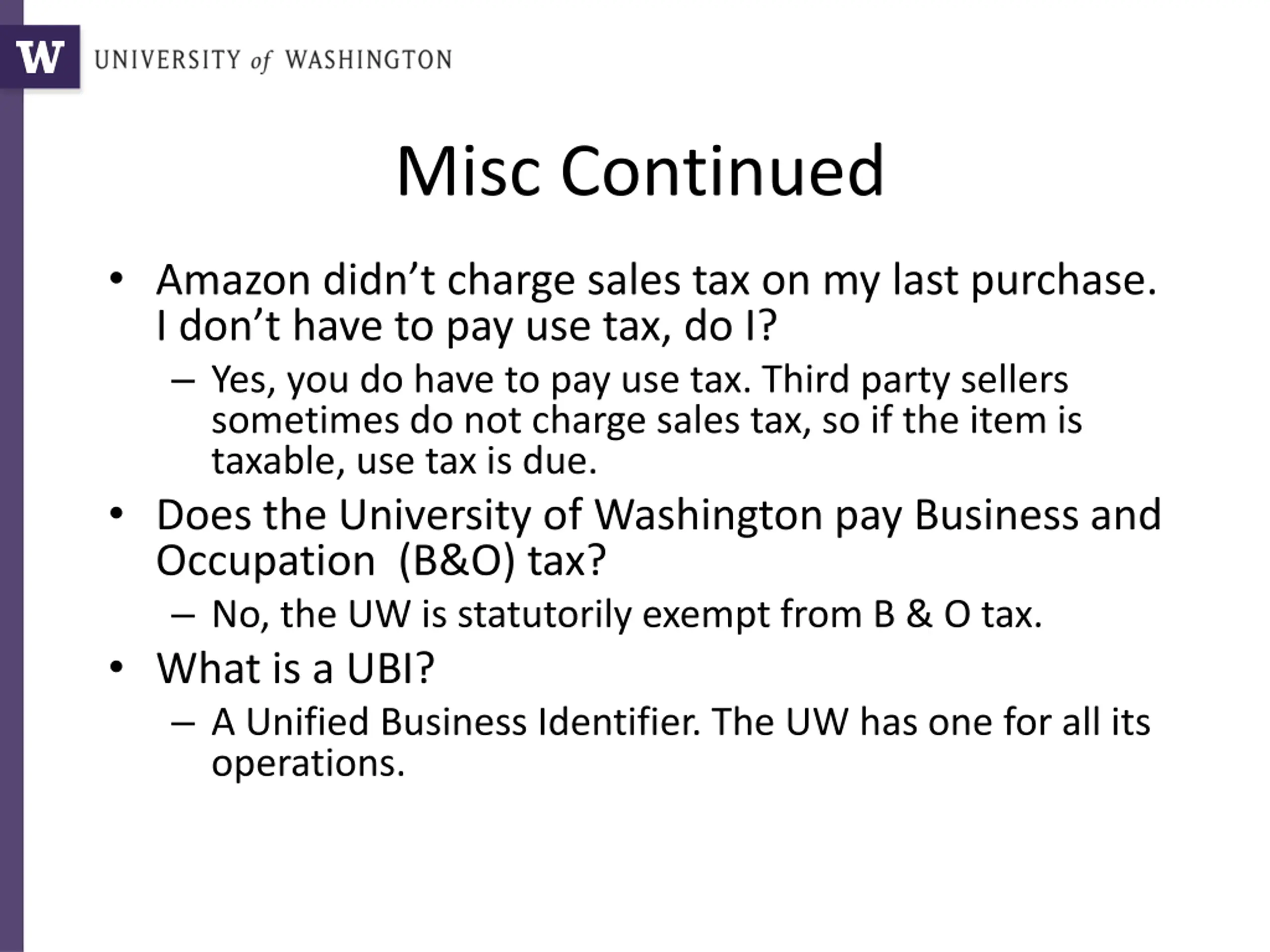 Misc Continued Amazon didn t charge sales tax on my last purchase. I don t have to pay use tax, do I? Yes, you do have to pay use tax. Third party sellers sometimes do not charge sales tax, so if the item is taxable, use tax is due. Does the University of Washington pay Business and Occupation (B&O) tax? No, the UW is statutorily exempt from B & O tax. What is a UBI? A Unified Business Identifier. The UW has one for all its operations.