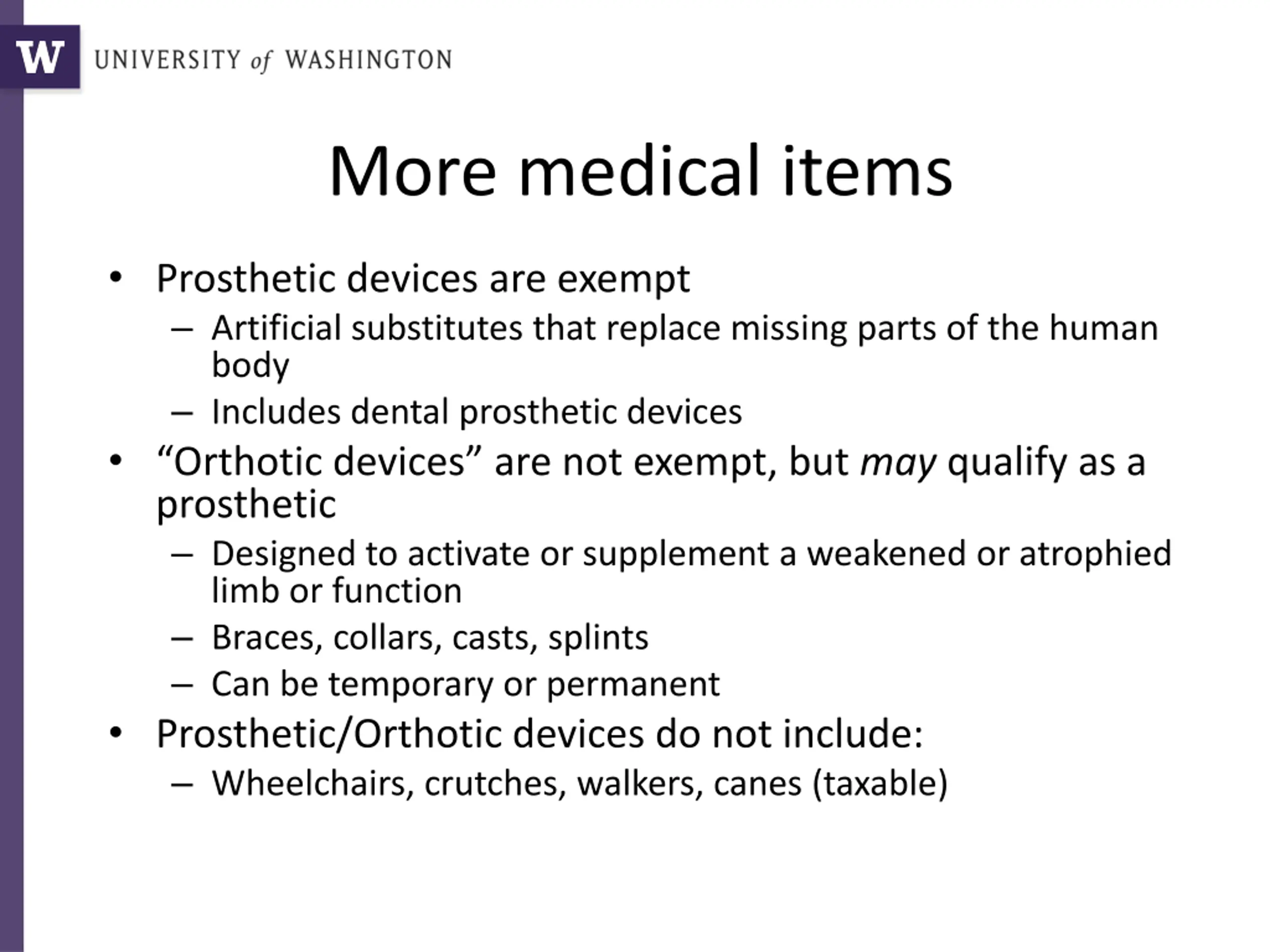 More medical items Prosthetic devices are exempt Artificial substitutes that replace missing parts of the human body Includes dental prosthetic devices Orthotic devices are not exempt, but may qualify as a prosthetic Designed to activate or supplement a weakened or atrophied limb or function Braces, collars, casts, splints Can be temporary or permanent Prosthetic/Orthotic devices do not include: Wheelchairs, crutches, walkers, canes (taxable)
