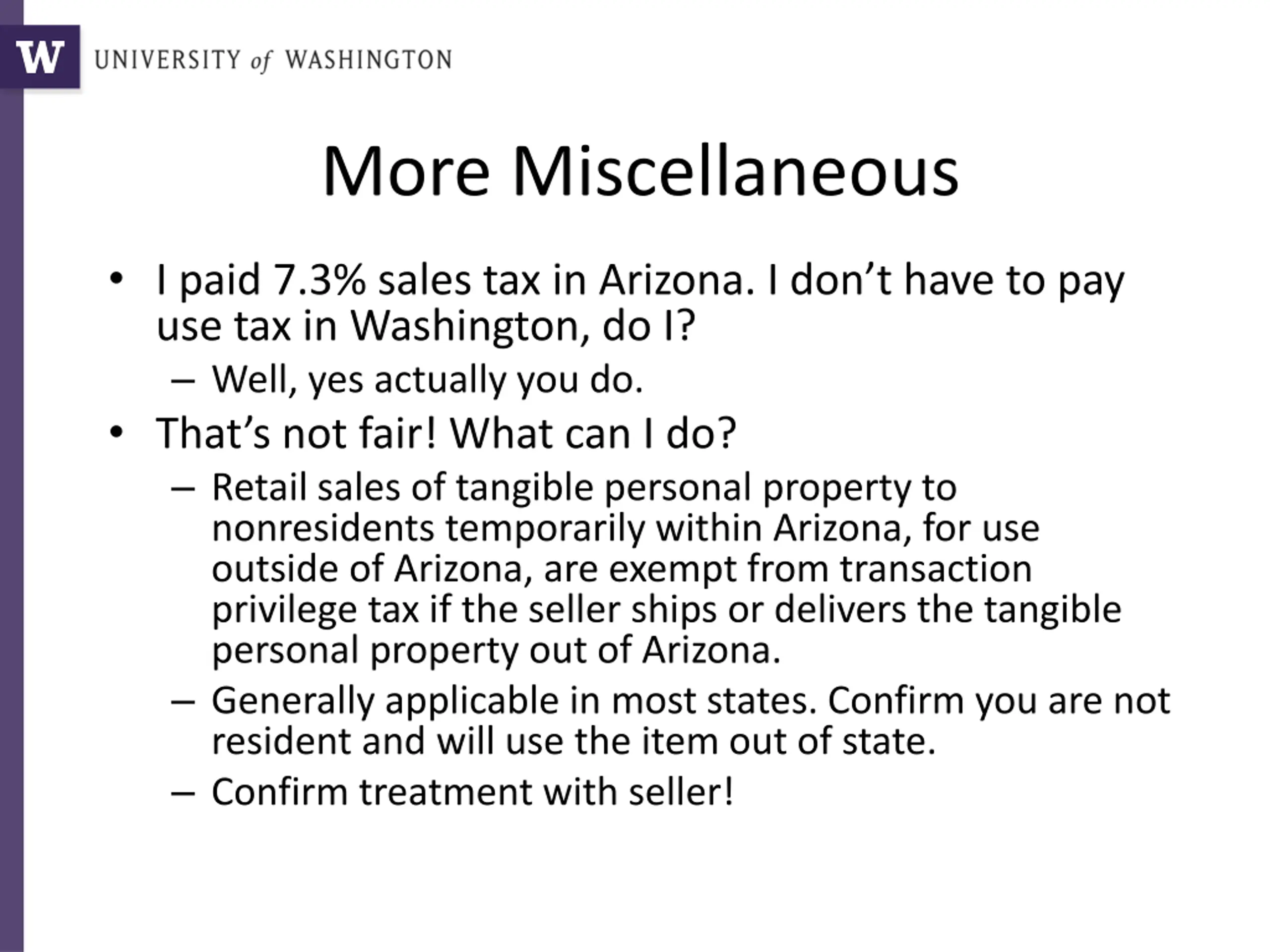 More Miscellaneous I paid 7.3% sales tax in Arizona. I don t have to pay use tax in Washington, do I? Well, yes actually you do. That s not fair! What can I do? Retail sales of tangible personal property to nonresidents temporarily within Arizona, for use outside of Arizona, are exempt from transaction privilege tax if the seller ships or delivers the tangible personal property out of Arizona. Generally applicable in most states. Confirm you are not resident and will use the item out of state. Confirm treatment with seller!