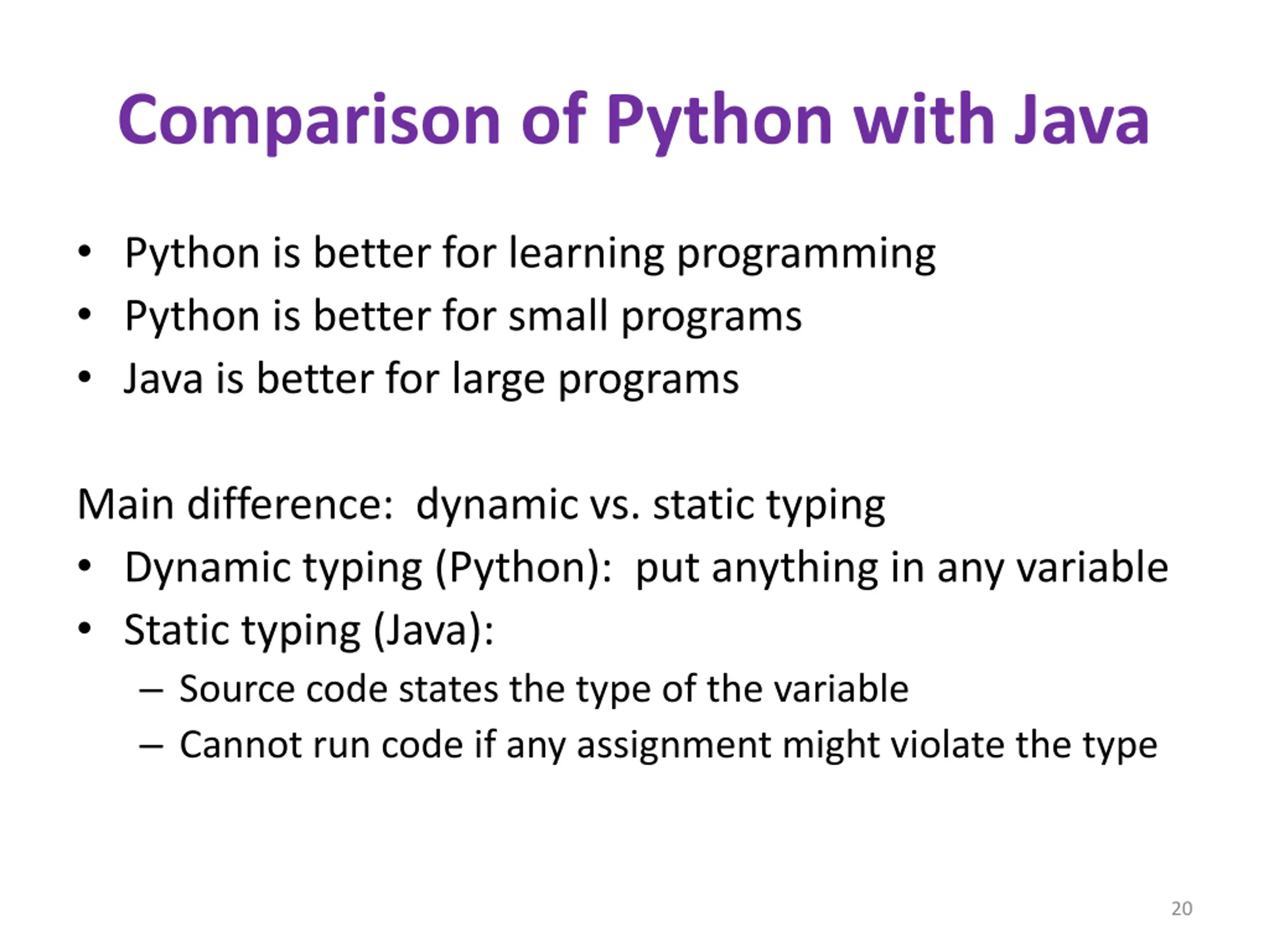 Comparison of Python with Java Python is better for learning programming Python is better for small programs Java is better for large programs Main difference: dynamic vs. static typing Dynamic typing (Python): put anything in any variable Static typing (Java): Source code states the type of the variable Cannot run code if any assignment might violate the type 20