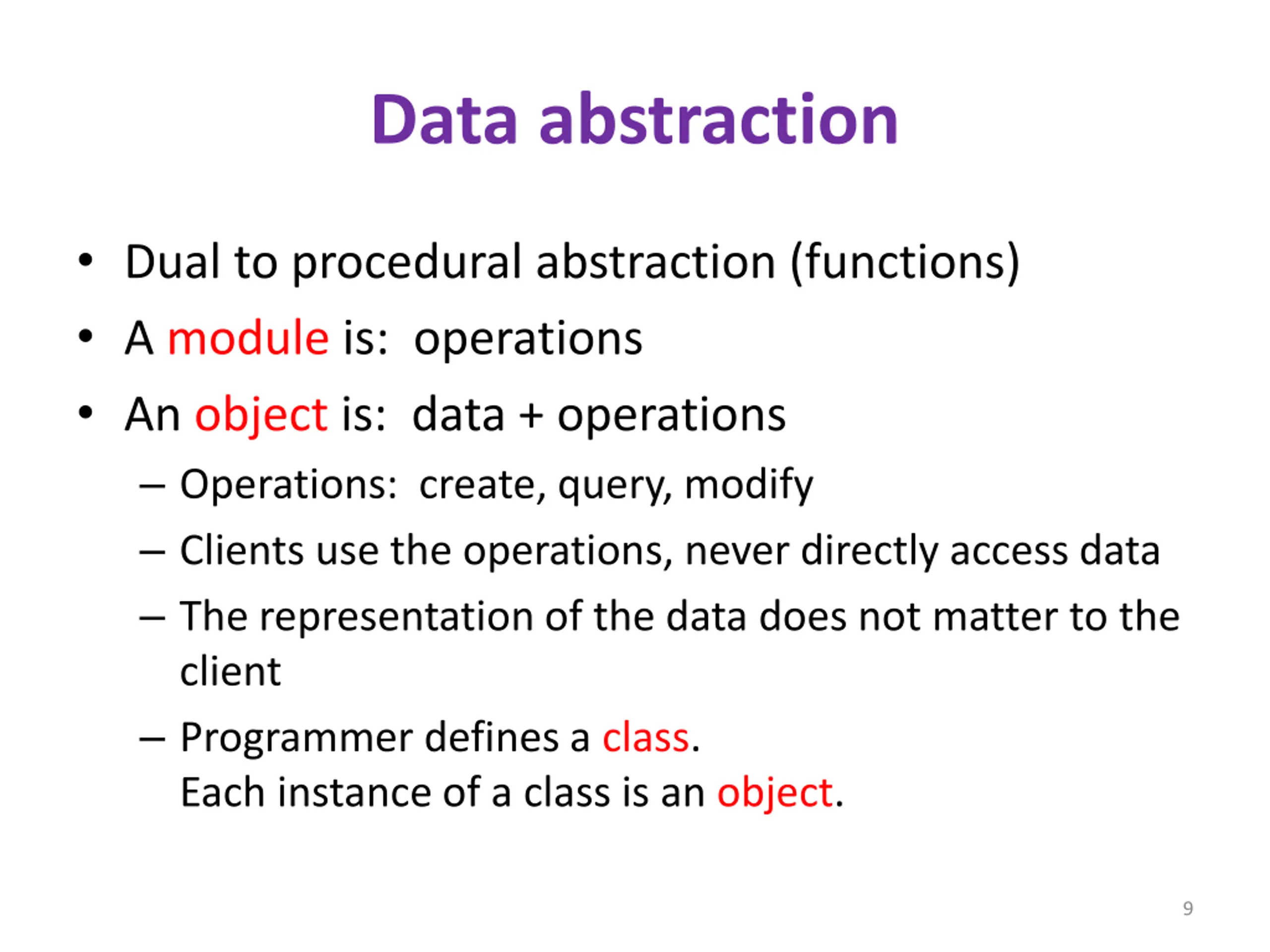 Data abstraction Dual to procedural abstraction (functions) A module is: operations An object is: data + operations Operations: create, query, modify Clients use the operations, never directly access data The representation of the data does not matter to the client Programmer defines a class. Each instance of a class is an object. 9