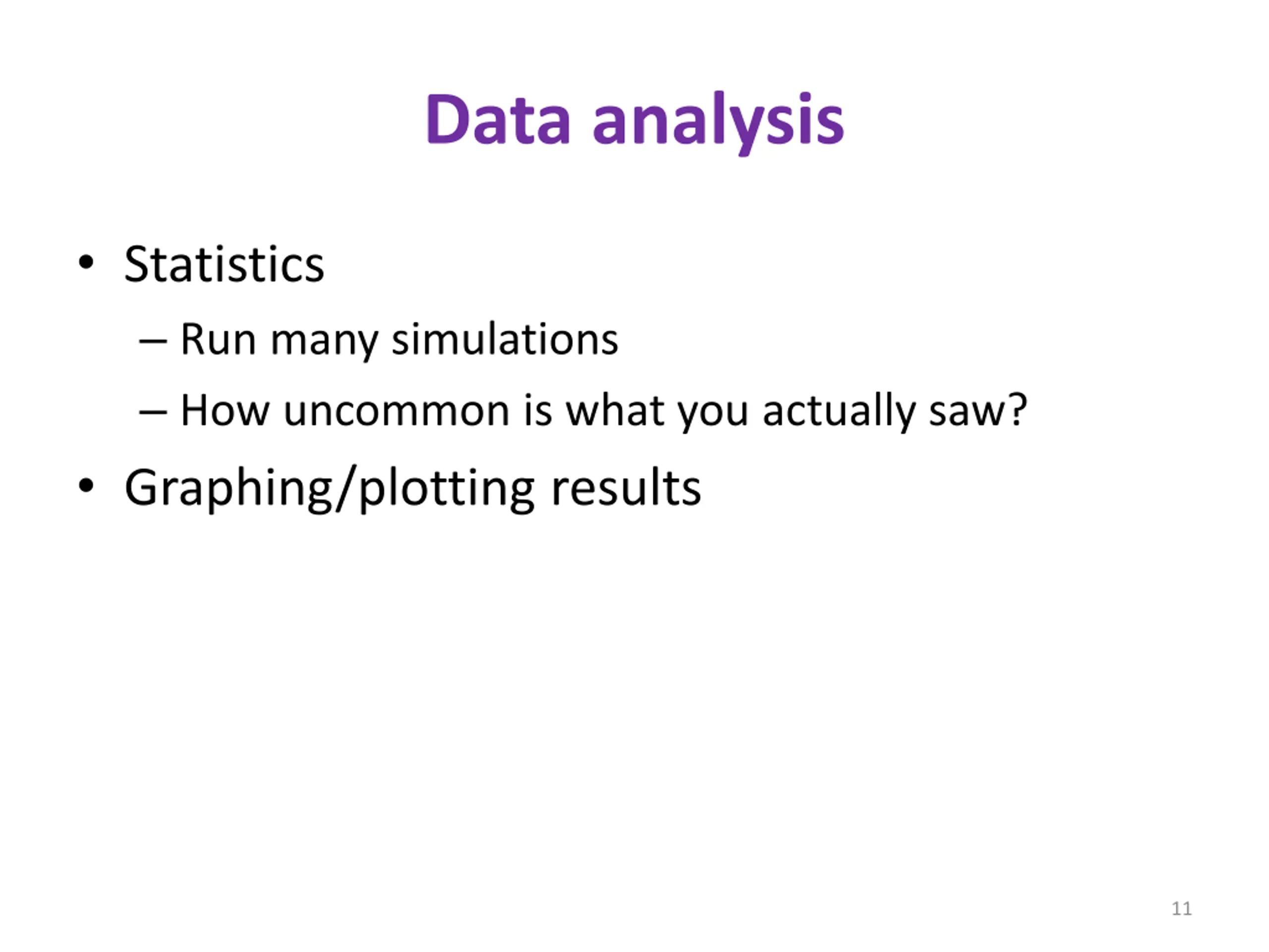 Data analysis Statistics Run many simulations How uncommon is what you actually saw? Graphing/plotting results 11