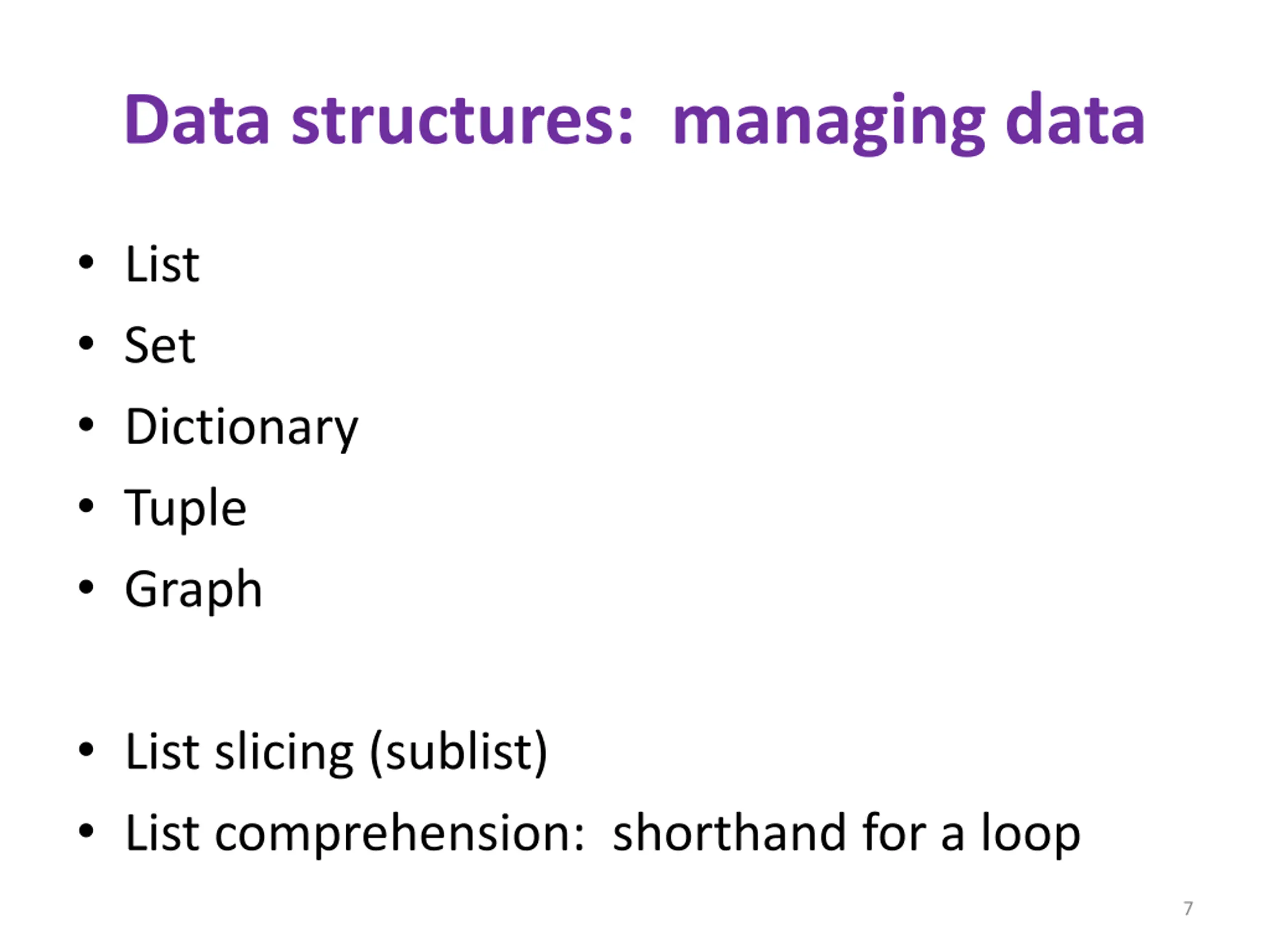 Data structures: managing data List Set Dictionary Tuple Graph List slicing (sublist) List comprehension: shorthand for a loop 7