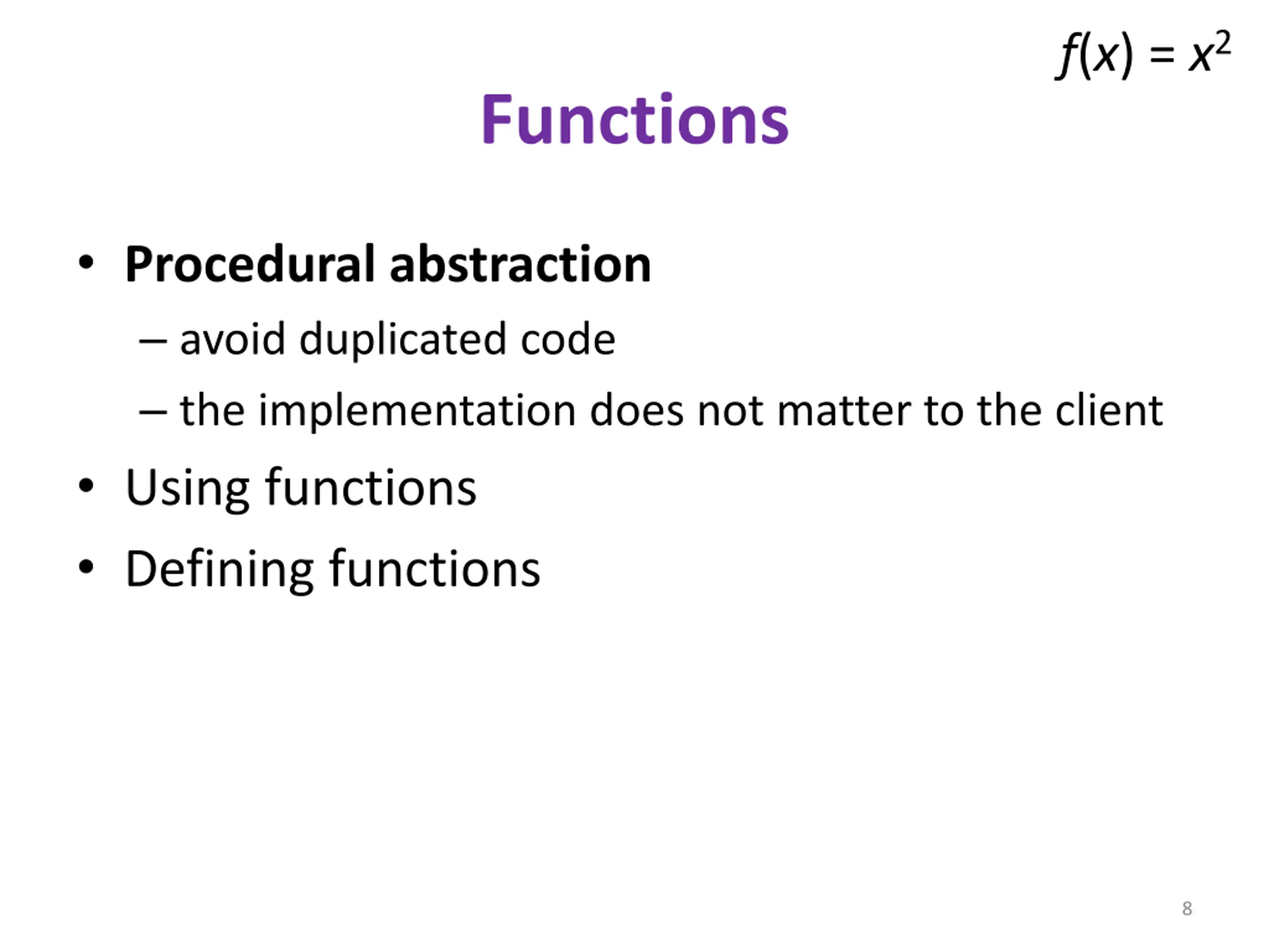 f(x) = x2 Functions Procedural abstraction avoid duplicated code the implementation does not matter to the client Using functions Defining functions 8