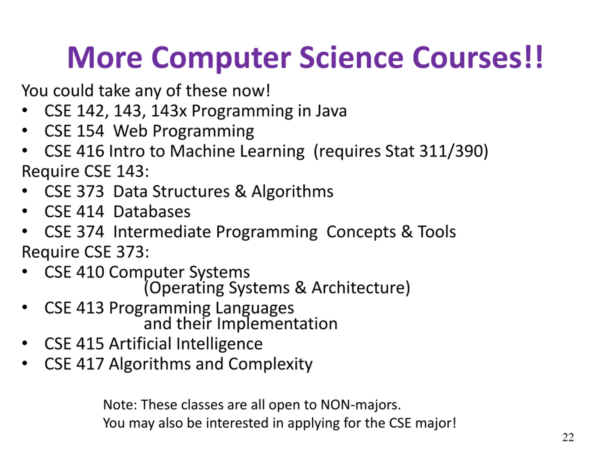 More Computer Science Courses!! You could take any of these now! CSE 142, 143, 143x Programming in Java CSE 154 Web Programming CSE 416 Intro to Machine Learning (requires Stat 311/390) Require CSE 143: CSE 373 Data Structures & Algorithms CSE 414 Databases CSE 374 Intermediate Programming Concepts & Tools Require CSE 373: CSE 410 Computer Systems (Operating Systems & Architecture) CSE 413 Programming Languages and their Implementation CSE 415 Artificial Intelligence CSE 417 Algorithms and Complexity Note: These classes are all open to NON-majors. You may also be interested in applying for the CSE major! 22