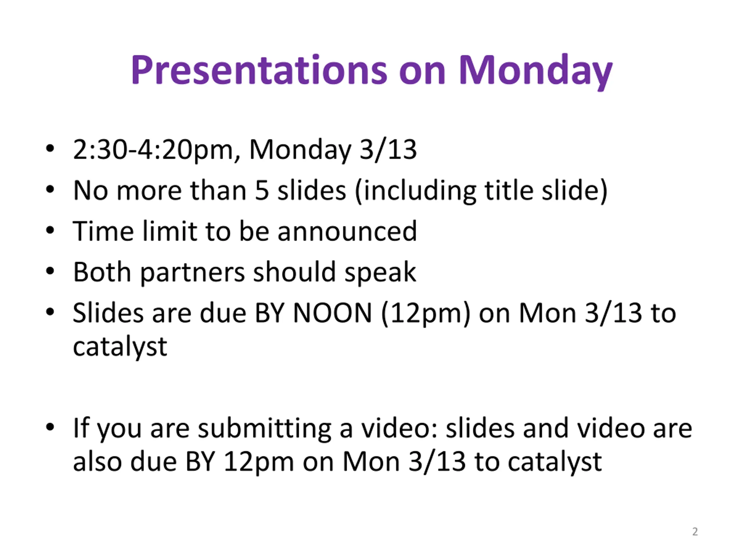 Presentations on Monday 2:30-4:20pm, Monday 3/13 No more than 5 slides (including title slide) Time limit to be announced Both partners should speak Slides are due BY NOON (12pm) on Mon 3/13 to catalyst If you are submitting a video: slides and video are also due BY 12pm on Mon 3/13 to catalyst 2