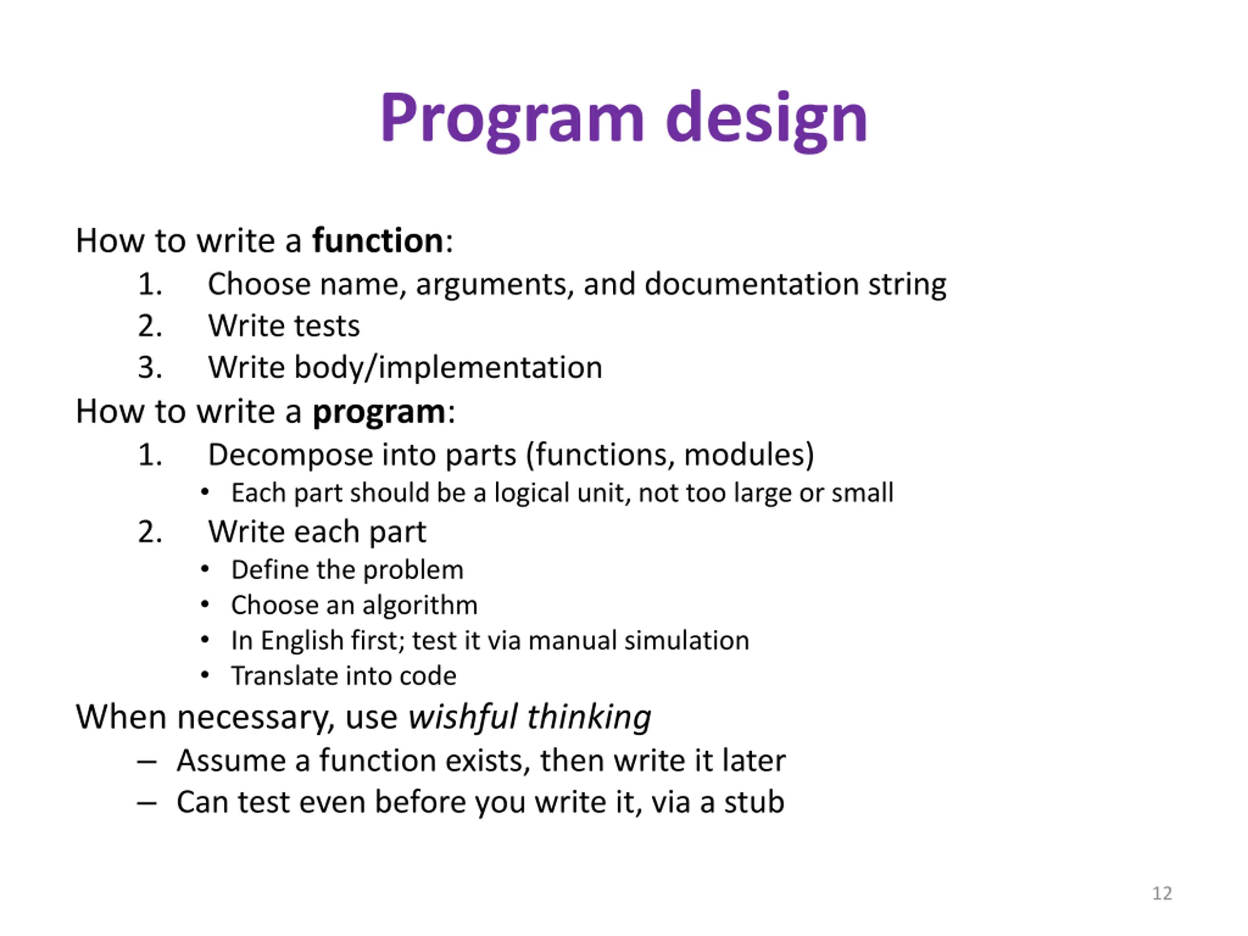 Program design How to write a function: 1. Choose name, arguments, and documentation string 2. Write tests 3. Write body/implementation How to write a program: 1. Decompose into parts (functions, modules) Each part should be a logical unit, not too large or small 2. Write each part Define the problem Choose an algorithm In English first; test it via manual simulation Translate into code When necessary, use wishful thinking Assume a function exists, then write it later Can test even before you write it, via a stub 12