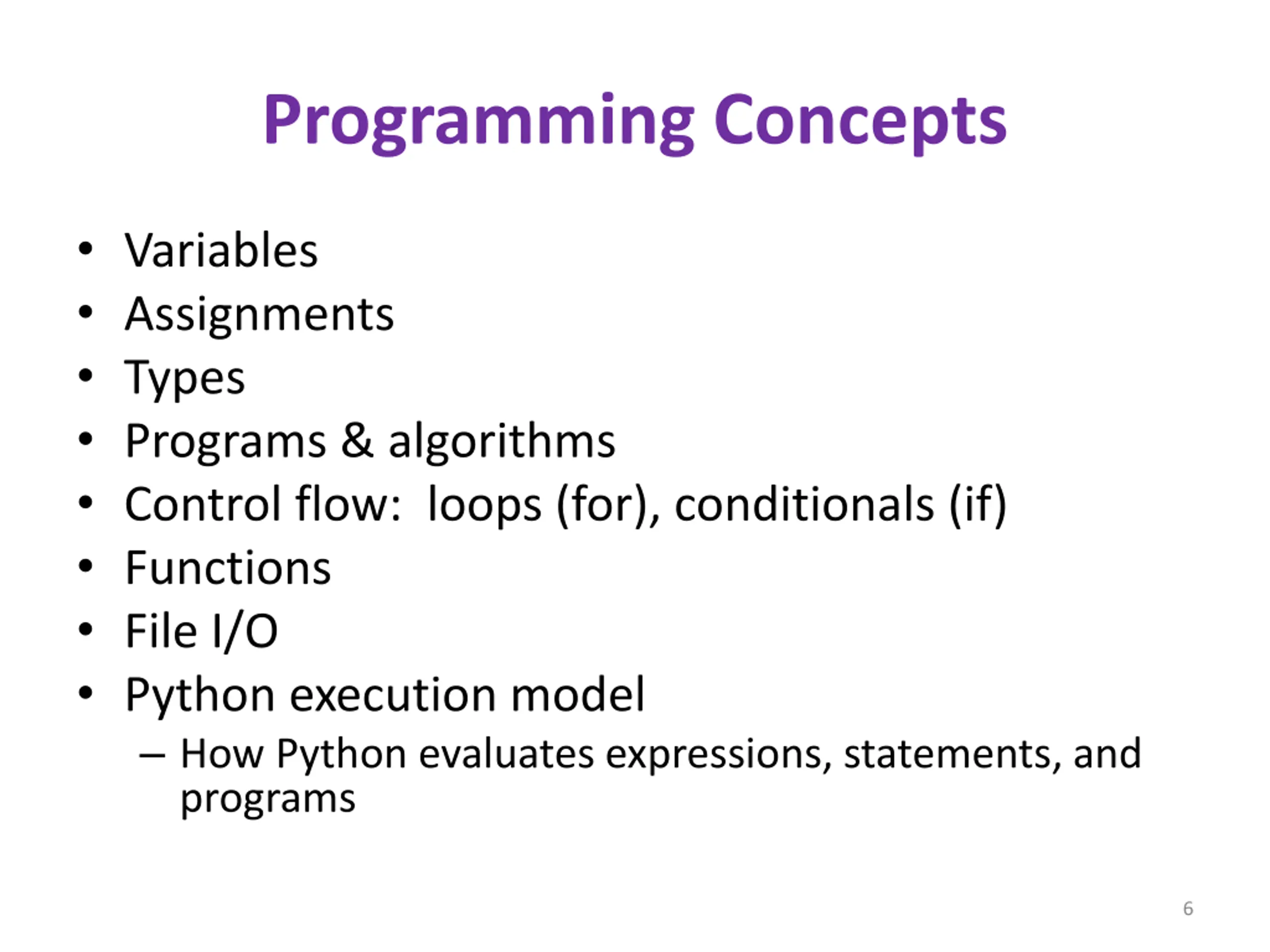 Programming Concepts Variables Assignments Types Programs & algorithms Control flow: loops (for), conditionals (if) Functions File I/O Python execution model How Python evaluates expressions, statements, and programs 6